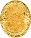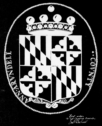 The shield was ensigned by a baron's coronet without the plush cap that lines coronets of rank. The band is richly chased, and four balls are shown (a baron's coronet has six, but two are hidden). However, suspended in space above the four balls was a fifth ball. It is possible that this might have been mistaken for the tassel that usually sits atop the plush cap. On one side of the shield were the words "Ann Arundell" and on the other side was the word "County." The whole achievement was set in an oval border.