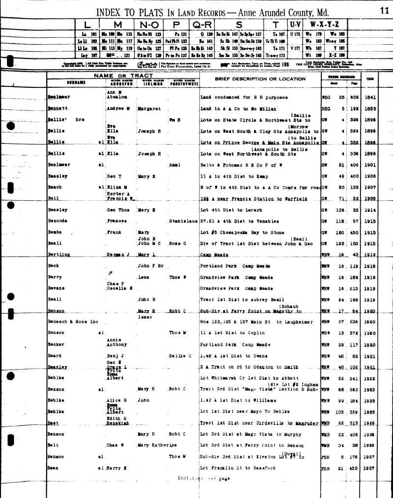 | Ann M BMlBftar Aba lorn t Land condemned for B R purpoaaa 1SG a5 602 1941 linnet t jAndraw M |argarat , Land In A A Co w Me Mlllan NHG 9 198 1855 BiUU1 hra fa B (Ball la Lota on State Circle at Northweat Sta to GW 4 326 1896 Ira Btllle Ella Joseph B (Morrow Lota on last South 4 Clay Sta Annapolle to GW 4 329 1896 jtra Bailie al Ilia ; (to Be 11 is Lots op Prln? rg ft Mtolo gu AnnapolM 1 3 Bellle al.Ella | Joseph H , (Annapolis to Ballla Lota on feat Northwest & South Sta GW 4 336 1896 Bealmear al Saal Balto & Potonac R R Co P of w 01 21 406 1901 Baa B ley Geo T Mary B 11 A in 4th Diet to Kanp GW 49 i ] 400 1906 Beach aljBllza M R of W in 4th Diat to A A Co Comre for roa GW 53 i j 135 1907 Barter A Ball Frenola W GW. 71. 1 22 19Q_ Beaaley Goo Thoe [Nary E Lot 4th Diat to Lararh GW 106 j_._ 33 1914 Bezooda Frances , .Stanislaus 7.21 A 4th Diat to Ve nab lee GW 116 57 1915 Banba Frank Mary Lot & Chesapeake Bay to Stona GW 120 450 1915 John B Baall . .John M C .Boaa G Baall Dir of Tract 1st Diat between John & Geo GW 123 ; 153 1915 Bertllng Hainan J Mary I CftBP Maade WNW 16_ i- 43 1919 Back .John F Sr Portland Park Caap Mead WNW 16 i 119 1919 Barry Lena Thos W Gran lew Park Caap Maada WNW 16 , 189 1919 Chaa F Be ran s Cecelia I Grandyien park Camp Meada WNW 16 , 213 1919 Baall John B Tract 1st Diat to Aubrey Be all WNW 24 , 196 1919 Banaon Mary H .Hobt C (Scnaub Sub-Div at erry Pot op Magothy to ffil __„.!?_ &L 1920 Isaac Banaaoh & Sons Ino NOB 123,125 & 127 Main St to Lauphelmer VNW 27 36 1920 Benaon al Thos M 11 A 1st Dist to Coplin WNW 13 372 1920 Annie Baokar .Anthony Portland Park Camp Maade WNW 9 i 117 1920 Beard ,Benj J , SalUe C 1,6 A lat Dist to Owens WNW 46 i 82 1921 Oao X Beazley ,fira9 L 3 A Tract on rd to Odenton to Smith INJ .. 48 LlM. .Jim. Fritz Bahlka Albert Lot Whitnarah Cr 1st Diat to Abbott WNW 52 , 241 1922 Banaon al Mary R Robt C (dir Lot ingham Tract 3rd Diat "Mau Vista" Section B Sub- WNW 66 , 363 1923 Bahlka .Alice B .John 1.42 A 1st Dist to Williams WNW 99 , 184 1925 Bah Ike Albert Lot 1st Dist near Mayo To Behlke WNW 105 , 359 1925 Edith S pa. at tflazafclaj) Tract Is! Diet near Birdirillfl -to Marud.er WMB 22 _313 1926 Banaon .Mary H ,Robt C Lot 3rd Dist at Mago Vista to Murphy WMB 22 . 406 1926 Belt .Chaa W .Mary Rather Lne Lot 3rd Diet at Ferry Joint to Benson WMB 34 36 1926 Banaon al Thos U • iDuvall jSut-dif 3rd Dist at Ilvaton Lot #7 to KSR 8 176 1927 Bean al Barry | Lot Franklin St to Basaford FSR 21 , 450 1927 |