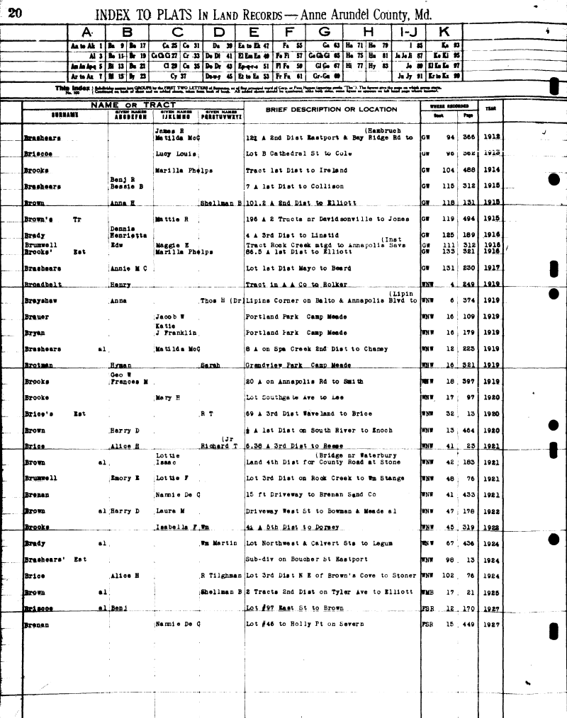 | James B Matilda Mc? (Hanbrucb 12J A nd )lat Eaatport at Bey Ridge Rd to OW 94 366 1912 Lucy Louie Lot B Cathedral St to Cole It VO oo ii ii5 Broojep Mar 111 Fh4lP Tract 1st Dlst to Ireland GW 104 466 1914 BenJ B BCftftairs) Be a ale B 7 A 1st Dlst to Colllson GW 119 312 1915 Bvovn Anna H Shellman B JfllJL.taA..Mai..JSft JUJlfii GW 119 131 1919 Bromfi Tr lame R 196 A 2 Tracts nr DOT Id eon T! lie to Jones Gi 119 494 1915 Dennis Irady Henrietta 4 A 3rd Dlst to Llnstld tlnst GW 125 169 1916 Brumwell Edw Maggie E Brooks' Eat Marllle Ph41ps Tract Rock Creek mtgd to Annapolis Save 66.5 A let Dlst to Elllott GW 111 GW 133 312 321 1916 1916 Braebeara iionle M C Lot 1st Dlst Mayo to Beard GW 131 230 1912_ Hanry Tract in A A .Co to Eolker EH. 4_ 249 1919 Breyshew Anna ,Thos U (Dr (Llpin Llplns Corner on Balto & Annapolis Bird to WNW 6 374 1919 Brtuer ;Jacob 1 Portland Park Camp Meede WNW 16 109 1919 Ka tie Bryan j Franklin, Portland Park Camp Meede WNW 16 179 1919 Bresheare al , [Matilda MoQ 6 A on Spa Creek 2nd Dlst to Chacey WNW 12 223 1919 Brctmen .fljnan gar Grand? lew Park Cairo Meade WW 16 i 321 1919 Geo W Brook .France H BO A on Annapolis Rd to Sttlth W 16 397 1919 BrOOke ;Mftry E Lot Scutoga tc Are to JLee WSW 17 97 1920 Bnee'e 1st ,R T 69 A 3rd Dlst WaVeland to Brloe WNV 32 13 1920 Brown .Berry D A 1st Dlst on Soutb Hirer to Enoch WNW 13 464 1920 Ur Brlee llce H .Richard T 6.36 A 3rd Dlst to ft ease WNW 41 23 1921 Lottie Brown al Isaac (Bridge nr faterbury Land 4th Dlst for County Road at stone WNW 42 163 1921 Brugwell fimory Lottte T Lot 3rd Dlst on Rook Creek to tm Btange WNW 46 76 1921 Brenan .Nannl e De Q 15 ft Driveway to Brenan Sand Co WNW 41 433 1921 Brown a 1 Harry D Laura M Driveway West St to Bowman It Meade al WNW 47 176 1922 Brooks I sa be 1 la f ) WB 44 1 oth piet to Dfirsey IHI 45 , 319 1922 Brmdy al fm Martin Lot Northwest & Calrert Sts to Legua WNW 67 436 1924 Bra shears' Est Sub-dlv on Bouober bt Sastport WNW 96 13 1924 Brloe Alice B R Tilghman Lot 3rd Dis t R E of Brown's Cove to Stoner WNW 102 76 1924 Browa al iSbellnan B Z Tracts 2nd Dlst on Tyler Ave to Elllott WMB 17 21 1925 BTlMPt aifienj Lot 497 East St to Brown IBB . ..!„ ,.17Q. W2?_ Brenen Nannle pe 0 Lot #46 to Holly Pt on Severn FSB 15 449 1927 |