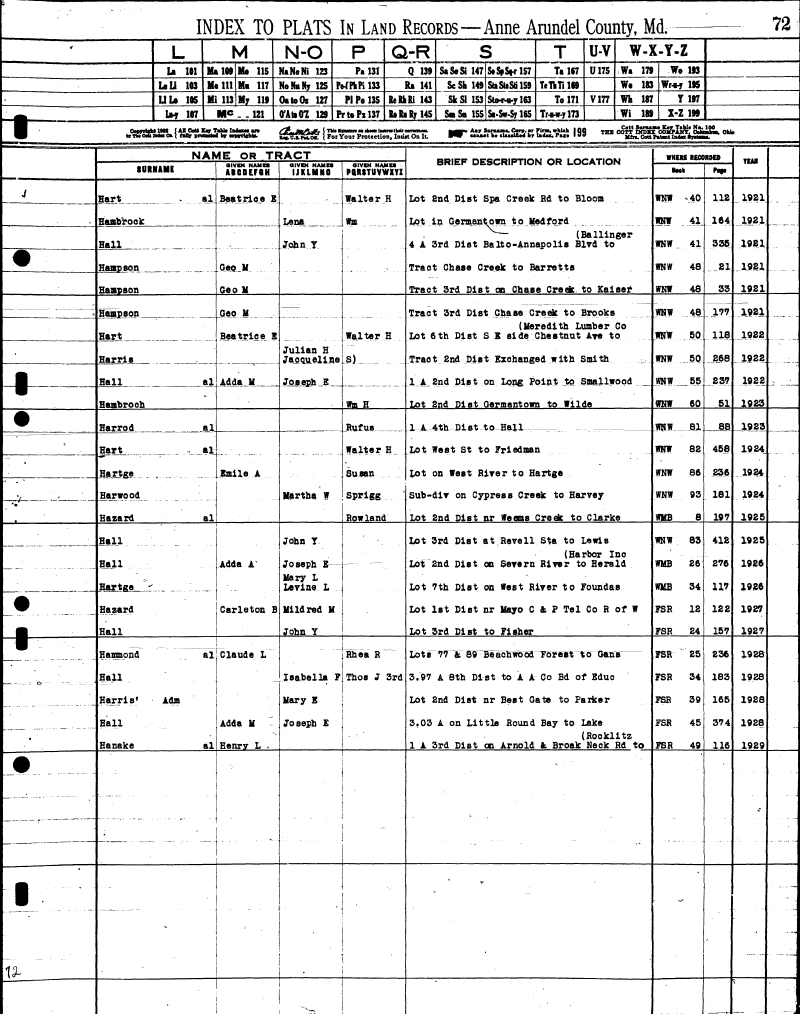 | Hart aL .Beat rice E Walter H Lot End Diet Spa Creek Rd to Bloom WNW -40 112 1921 Hambrock Lena Wm Lot in Germantown to Medford WNW 41 164 1921 Hall John Y (Ballinger 4 A 3rd Diet Ba It p- An nap olis Blvd to WNW 41 335 1981 Hampson Geo M Tract Chase Creek to Barret ts WNW 48 21 1921 Hampson Geo H Tract 3rd Dist on Chase Creek to Kaisei WNW 48 33 1921 Hampson Geo M Tract 3rd Dist Chase Creek to Brooks WNW 48 177 1921 Hart Beatrice S Walter H (Meredith Lumber Co Lot 6th Dist S E side Chestnut Aye to WNW 50 118 1922 Julian H Harris JacauelineS) .Tract 2nd Dist Exchanged with Smith WNW .50 26.8 !2. Hall al Adda M Joseph S 1 A 2nd Dist on Long Point to Small wood WNW 55 237 1922 Hambroch Wm H Lot 2nd Dist Germantown to Wilde WNW 60 51 1923 Harrod al Rufus X A4th Diet to Hall- WNJL .81 88 1923 Hart al Walter H Lot West St to Frledman WNW 82 458 19.24, Hartge . ..Smile .A . Susan Lot on West Riyer to Hartge WNW 86 236 1924 Harwood Martha W Sprigg Sub-dlr on Cypress Creek to Harvey WNW 93 181 1924 Hazard al Rowland Lot 2nd Dist nr Weens Creek to Clarke WMB 8 197 1925 Hall John T Lot 3rd Dist at Revell Sta to Lewis WNW 83 412 1925 Hall Adda A' Joseph E (Harbor Ino Lot 2nd Dist on Severn Riyer to Herald WMB 26 276 1926 (. Mary L Bar tge "..;. •-. Leyine L . 1. i Lot 7th Dist on West Riyer to Foundas WMB 34 117 1926 Hazard Carle ton B Mildred M . . . | Lot 1st Dist nr Mayo C & P Tel Co R of W FSR 12 122 1927 Hall John Y Lot 3rd Dist to Fisher FSR 24 157 1927 I Hammond al Claude L jRhea R Lots 77nST 89Eeacbwooa Forest to Gans FSR 25 236 1928 Hall Isabella F Thos J 3rd 3.97 A 8th Dist to A A Go Bd of Educ FSR 34 183 1928 Harris Ada Mary E --- -- - -- .-- . - . | Lot 2nd Dist nr Best Gate to Parker FSR 39 165 1928 1 Hall Adda M Jo seph E 3,03 A on Little Round Bay to Lake FSR 45 374 1928 Hanake al Henry L (Rocklitz 1 A 3rd Dist on Arnold fc Broak Neck Rd to FSR 49 116 1929 |