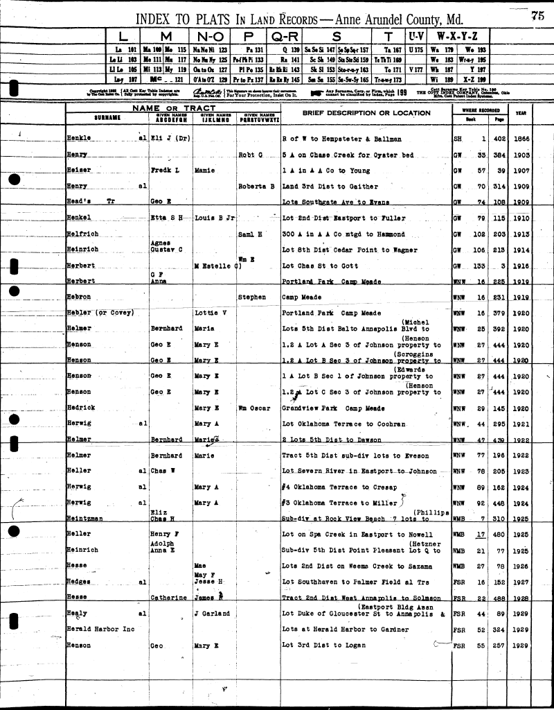 | Henkle al Eli J (Dr) 1 R of W to Hempsteter &. Ballman SB 1 402 1866 Henry Robt G 5 A on .Cbaee Creek for Oyster bed GW . 33 384 1903 HeiaeiL J Fredk J, Mamie 1 A in A A Co to Young GW 57 39 1907 Henry al Boberta B Land 3rd Dist to Gait her GI 70 314 1909 Head s Tr Geo E Lots Souttaate Ave to Evans GW 74 109 1909 Henkel Etta S H — Louis B Jr Lot 2nd -Dlrst Eastpqr t to Fuller GW 79 115 .1910 Hlfrich. „ .Saml H 300 A in A A Co mtgd to Hammond GW 108 203 1913 Agnes Heinrioh Gustav C Lot 8th Dist Cedar Point to Wagner GW 106 213 1914 Wm B Herbert .. M Estelle 0} Lot Cbas St to Got t GW. 133 3 1916 G F Herbert Anna Portland Faric Camp Meade WNW 16 225 -Ifllfi. Hebron Stephen Camp Meade WNW 16 231 1U9 Hebler [or Covey) Lot tie V Portland Park Camp Meade WNW 16 379 1920 Helmer Berahard Maria (Miohel Lots 5th Dist Balto Annapolis Blvd to WNW 25 392 1920 Henson Geo B Mary E (Henson 1,2 A Lot A Sec 3 of Johnson property to •UW 27 444 1920 Henson Geo E Mary E (Scroggins 1.2 A Lot B Sec 3 of Johnson property to WNW 27 444 1920 Henson- Geo E Mary E (Edwards 1 A Lot B Sec 1 of Johnson property to WNW 27 444 1920 Henson Geo E Mary E (Henson l,2j& Lot C Sec 3 of Johnson property to WNW 27 J444 1920 Hedrick Mary E Wm Oscar Grandview Park Camp Meade WNW 29 145 1920 Herwig Mary A Lot Oklahoma Terrace to Coohran WNW. 44 295 1921 Helmer Bernard yari 2 Lots 5th Dist \o Dawaon WNW 47 43Q -122. Helmer Bernbard Marie Tract 5th Dist sub-div lots to Eve son WNW 77 196 1922 Heller Cbas 1 LotSe ve rnJiiver in- East port—to- Johnson — WNW 78 205 1923 Herwig Mary A #4 Oklahoma Terrace to Cresap WNW 89 162 1924 Herwig Mary A & . #3 Oklahoma Terrace to Miller ) WNW 92 448 1924 Eliz Heintzman Chaa H (Phillips Sub-dir at Rock View Beach '7 lots to WMB 7 310 1925 Heller Henry J Lot on Spa Creek in East port to No we 11 WMB 17 480 1925 Adolph Heinrich Anna E (Hetzner Sub-div 5th Dist Point Pleasant Lot Q, to WMB 21 77 1925 Hesse Mae Lots 2nd Dist on We ems Creek to Sazama WMB 27 78 1926 May F Hedges Jesse H Lot South haven to Palmer Field al Trs FSR 16 152 1927 Hesse Catharine James Tract 2nd Dist West Anna polls to Solmson FSR 22 488 iaaa. Healy J Garland (Eastport Bldg As an Lot Duke of Gloucester St to Annapolis & FSR 44 89 1929 Herald Harbor Inc Lots at Herald Harbor to Gardner FSR 52 324 1929 Henson Geo Mary E j Lot 3rd Dist to Logan C FSR 55 257 1929 |
