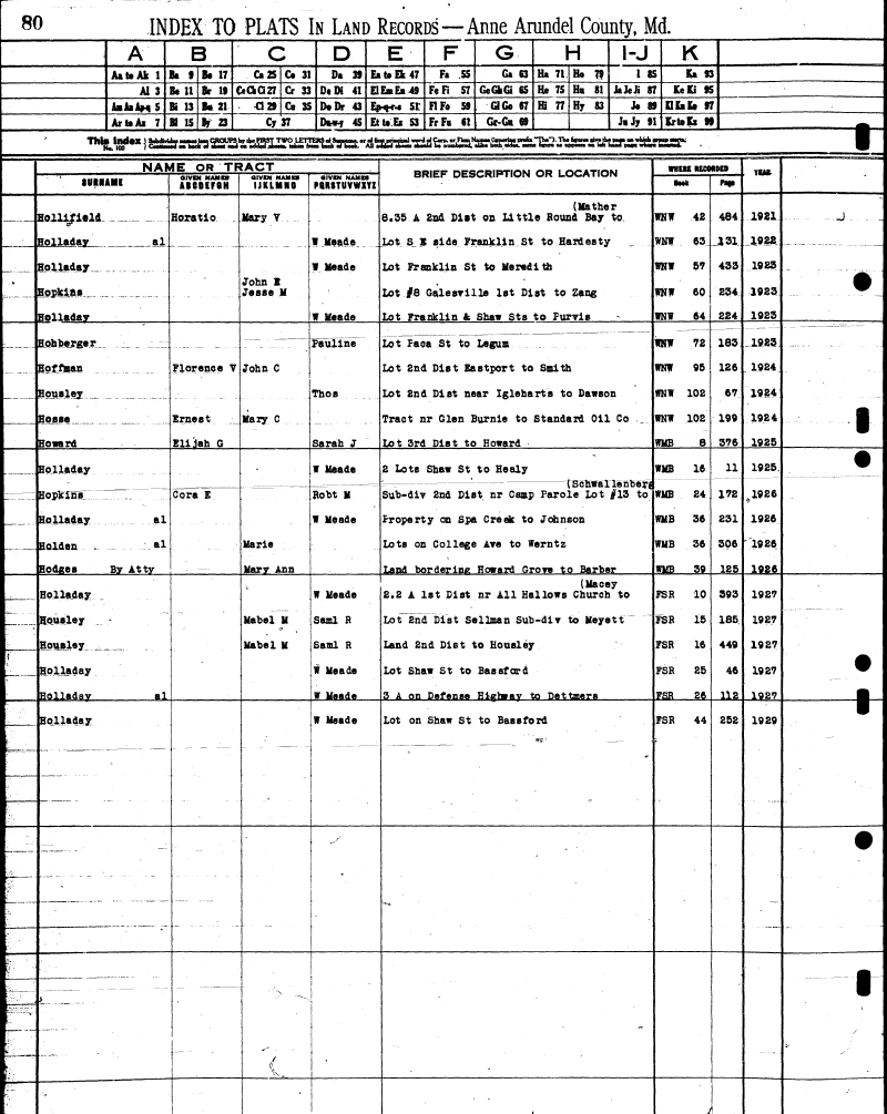 | HolZpitld. Horatio Mary V (Ma the r 8.35 A 2nd Diet on Little Round Bay to WNW 42 484 1921 Holladay al f Maade Lot S aide Franklin St to Hardesty WNW 63 131 ,1922. iplladay W Meade Lot Franklin St to Meredith WNW 57 433 1923 John B Efipisiftfi . Jesfle If Lot f 8 Galesyille lat Dist to Zang WNW 60 234 J9S3 Holladay W Meade Lot Franklin & Shaw Sts to Purr is WNW 64 224 1923 Bobberger., r . Pauline Lot Paoa St to Legum WNI 72 183 .1983 Hotftttan . Florence V John C Lot 2nd Diet East port to Smith WNW 95 126 1924 Houaley Thos Lot 2nd Diet near Igleharta to Dawson fNW 102 67 1924 Hoaae Ernest Mary C Tract nr Glen Burnie to Standard Oil Co WNW 102 199 1924 Howard Elijah G Sarah J Lot 3rd Diet to Howard WMB 8 376 1925 Holladay W Maade 2 Lots Shaw St to Healy WMB 16 11 1925. B0sfetwLl Core E Robt M (Schwallenber Sub-diy 2nd Diat nr Camp Parole Lot |13 to WMB 24 172 1926 t Holladay al W Ueade Property on Spa Creek to Johnson WMB 36 231 1926 JHolden :.al Marie Lots on College Aye to Werntz WMB 36 3Q6 '1926 podges By Atty Mary Ann Land bordering Howard Grore to Barber WMB 39 125 1926 Holladay W Meade (Macey 2.2 A 1st Dist nr All Hallows Church to FSR 10 393 1927 " Hojaaley Mabel M Saml R Lot 2nd Dist Sellman Sub-diy to Meyett "FSR 15 185 1927 Houaley Mabel M Saml R Land 2nd Dist to Housley FSR 16 449 1927 Holladay W Meade Lot Shaw St to Bassford FSR 25 46 1927 Holladay al W Meade S A on Defense Highway to Dettmers FSR 26 - lift 1927 Holladay W Meade Lot on Shaw St to Bassford FSR 44 252 1929 |