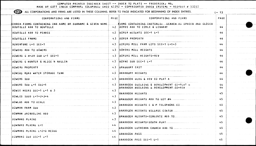 | _J EA8CH lifiJLS^ CmiAlJSlNG IfcID N AM£ BY SURNAME & GX VEN NAME BOUTELLE ADO TO 80UTELLE j 42 ..—._.._-..-—_____.__.__...____.-..—..-......_. -.. _...._ _______.._._-—......_.. ...„._... .._........ ...|.____..._... BOUTELLE ADD TO PEARCE J 42 80UTELLE FARMS 43 30VENTURE L-1 SEC-1 43 BOWERS ADD TO BOWERS 43 DOWERS G H-JR SUB L-1 SEC-1 43 BOWERS G HUNTER S, ALICE N NALLIN 43 BOWERS PROPERTY 43 BOWERS ROAD WATER STORAGE TANK 43 BOWERS SU8 43 BOWERS SUB L-1 SEC-1 43 80WIE HEIRS SEC-1 L-1 43 43 OOWLES SUOD L-1-2-3-4 43 80WLUS ADO TO OIOLE 43 BOWMAN FARM SUB 43 BOWMAN JACQUELINE ADD 43 BOWMANS PLAINS 43 BOUMANS PLAINS L-1 44 BOWMANS PLAINS L-2-3 RESU8 ] 44 BOWMANS SU8 SEC-1 L-1 '. 44 ! i 1 L8HS-.. CONT.AlHifcLG-JUH-TJJLLSi__££JUlCJi_A£. SPAC-EH AMD CLOS £0 BOYDS AOO TO COYLE & LENHART | 44 __ _ __ __ ___ _____ ! BOYER HEIGHTS SEC-1 L-1 | 44 BOYER PROPERTY ! 44 BOYERS MILL FARM LOTS SEC-1 L-1-3 j 44 BOYERS MILL HEIGHTS 44 BOYERS MILL HEIGHTS-REV 44 BOYNE SUB SEC-1 L-1 44 BRADBURY EAST 44 BRA08URY HEIGHTS ; 44 BRADOOCK OLDG & DEV CO PLAT A i 44 BRADDOCK BUILDING & DEVELOPMENT CO-PLAT b 44 BRADDOCX BUXL0IW&....&. 0£W£U>P»£N:i__CO=JK£V...---. 44 BRADOCCK HLJiiHTS ..................... -.---_.--._....-—........- 45 eaAOOOCK HEIGHTS ADO TO LOT #4 -__ 45 j BRAOOOCK HEIGHTS C &PT£L£PHOM£ CO ; 45 BRACDOCK. HEIGHTS VILLAGE X£NT£a_ 45 BRAOOOCK HfclGHTS-COBLENIX ADD XQ„- | 45 BRAODOCK HEIGHTS-SOUTH PLAT_.._....__ . ! 45 BRADDOCK LUTHERAN CH4JRCH A DC TO -^- 45 B.RAD.0COC-..PASS. .......... -.-..-.._.............-._.-_...-......... . .- . ', 45 j i } B8AOHOCK PASS SEC-1 L-1 .-..-. - -- .- ', 45 j |