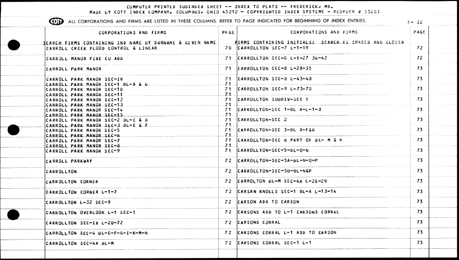 | J EASCJi FI8MS CONTAINING IN8 NAME BY SURNAME ..A. 61 YEN NAME i CARRQLL CREEK FLOOD CONTROL & LINEAR 70 CARROLL MANOR FIRE CO ADO 71 CARROLL PARK MANOR 71 CARROLL PARK MANOR SEC-IV 71 CARROLL PARK MANflR SEC^-t BL-A & JB 71 CARROLL PARK MANOR SEC-10 71 CA&R&U. PARK MA^aaSEC-11 ^ . 7_1 CARROLL PARK HANOR SEC-12 71 £ARRI1J.,L_PARK-MAMOR^S£C-13 ......_.._...._.... 74 . CARROLL PARK MANOR SEC-14 71 .._. C ARRUI-L PARK MA^QS SEC-15________________-_____._..._... ............ .................... .7.1... ... CARRQLL PARK MANOR SEC-2 8L-C & D 71 _.. CARROL^PASK MANOR SEC-3BL-E i..J_._.._..._......._ _. . ....... ............... ........._........... 7.1...... CARROLL PARK MANOR SEC-5 71 CARRQLLP.ARK_mAiiQR__S-££-6 .....-....._._..._..._-.-._-....._......-.__-..-...-...-_. ^ ZJ CARROLL PARK MANOR SEC-7 71 £ARROLL PARK MANOR ^EC-S _ J71 CARROLL PARK MANOR SEC-9 71 CARROLL PARKWAY 72 CARROLLTON 72 CARROLLTON CORNER 72 i _.._...__._ .___..__.. _.._.._.___.... ....._.............. .__... .____.. __.. ^ _.__._, _ .. |.. CARROLLTON CORNER L-1-7 j 72 _ ___._._____..... ____._.____.____..____..._.-...... ... ..__..-... __._______..___._.... ..-.._._.._ .....__...._....__... -_...L.-.. __..........^... CARROLLTON L-32 SEC-9 j 72 ..____..__________._...._.__.__.._..__............._____..._......__..._._._...____...__..._...._.___[.-_.______ CARROLLTON OVERLOOK L-1 SEC-1 72 CARROLLTON SEC-IX L-20-72 72 CARROLLTON SEC-4 BL-E-F-G-I-K-M-N 72 CARROLLTON SEC-4A 8L-M 72 11RMS CQMT AIMiiy G 1 MI I lALSi- 5£Afi£ii_ A S. S P A C E D AJil 0 .. CLO S E-0 : CARROLLTON SEC-7 L-1-19 72 CARROLLTON SEC-S L-1-27 36-42 : 72 CARROLLTON SEC-8 L-23-35 73 CARROLLTON SEC-8 L-43-4S S 73 CARROLLTON SEC-9 L-73-78 73 CARROLLTON SUBDIV-SEC 1 ; 73 CARROLLTON-SEC 1-BL A-L-1-3 73 CARROLLTON-SEC 2 73 _., _ _^ _ _ _ _ ___ _ ____ _ . ' CARROLLTON-SEC 3-OL D-FSG 73 CARROLLTON-SEC 6 PART OF BL- MSN 73 CARROLLTON-SEC-5-BL-O-N ?3 CARROLLTON-SEC-5A-BL-N-0-P 73 CARROLLTON-SEC-5B-BL-N&P 73 CARROLTON BL-M SEC-4A L-2S-29 73 CARSAN KNOLLS SEC-1 BL-A L-13-14 73 CARSON ADD TO CARSON 73 CARSONS ADD TO L-1 CARSONS CORRAL j 73 CARSONS CORRAL i 73 CARSONS CORRAL L-1 ADD TO CARSON 73 CARSONS CORRAL SEC-1 L-1 73 |