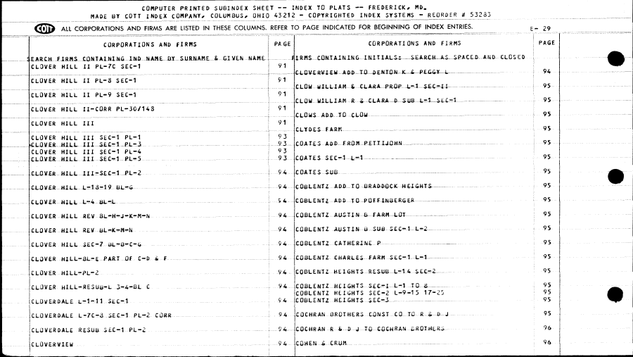 | J .EA.R.CiL.-£lfiHS_.JUJllI.AI.liai4a...ai*]>..--*4Aa£-..JaY-_SUiULAM£..-.& GI V£N NAM£ j CLOVER HILL II PL-7C SEC-1 I 91 ._.._...__......_. _.. _.. _ __..__._.__.............. _„__.._ __.._. _ _._._..__._._. _.._.... _„ _.._._L_. __. CLOVER HILL II PL-3 SEC-1 j 91 ,...„. .......__.—.. _ _ ...._. ..... „,, .,_.._.. _.._ .. .,... ..__...._................ . __ ,_...._ .,__... ...... ........ _. -.. . .. .-.. ... ....... ..._...-.._._............ ..... ... --. ............ . ... - . ...._.. .. .. -_... j. ....... .. CLOVER HILL II PL-9 SEC-1 91 CLOVER HILL II-CQRR PL-30/143 91 CLOVER HILL III 91 CLOVER HILL III SEC-1 PL-1 93 CL&VE8. HILL ill S£C-1-PL-3 .. . . .... . ......... ........... ._.._.... .. ................ _........_ .93 CLOVER HILL III SEC-1 PL-4 93 CLOVER MILL ill SEC-1 PL- .5 ........ 93 tLQV£&-MlLL lll^$£t-l -PL-2 . ....... .... .................. . .... ..... . . .. . j ..9...4... CLOV£R-M1LL L-ia-19 EL-4i - ........................................... ................ ........... ....94. - ... CLO-V..£R...WXLL .L--4--aL.-L.. ................. . -..._.... ......_........... ... .... ..... ...5.4.-- CLQVER HILL S£V 3L-H-J-K»M-N 94 CLOVER HILL 8£V BL^K-M-M 94 CLOVES HILL S£C-7 BL-B-C-a 94 | CLOVER HlLL-3L-£ PA&I Of C-0 £ f........................................ 94 CLOVER ttILL-PL-2 .. i 94- CLOVER HlLL-R£SUe-L J-4-BL C i 94 !CLOVE«OAL£ L-1-11..S£C-1 - .... ........ - . ...; S4 . CLOV£80AL£ L-7C-a S£C-1 PL-2 COSfi . .j..94 .|CLOV£ROAL£ RES-US- SEC-1. PL-2 .-. - ........ . . ... .- - -. ;... . 9.4--. CLOVERVIEW ; 94 iRMS COHTAliilHG-I.fclJUALS^ — S£AJICH-AS^ SPAC-&0- AtIO CLOSCO j CUJV4*ltl4M_JUM^.-TO-^4l*taN-JC-i—RE^ i 94 CL0«--¥JLLlAH---£.-4XA^.^.ftQp-...4^ 95 CLOU WiLLI AM & -£.._C4JUW~0--5-US-L=^—Si4=.t-----.-—.-.---— 95 CLOWS AWX- 10 -CLOW- ..........„__-.-.._-._._.___ . ........„...._........,. 95 CLTO£S f ASM ...-.__.................................................._._______„.._._...........-..._...-._.-..-.... ... 95 cOAX£S AJJB Eaaa P£iiij0m__.-._..____..._.._......_.............._.-.-... 95 COAT£S.. StC*4._L,st-..-.-..—-.__—_ .......-—_„ ............. .- ..... .. . ..... . : 95.- COAXES SUB .-. .....__—.——.._..-__....._._....._............._... ..... 95 C-08L.ENTZ AD4X 10 BRAWQtK--H.fcl44iI.4-__ ~ : 95 COBLEMTl Al>0 Ta-POffiHSiR4&R __.................._..— _.. I 95 COBLEN-TZ AUSTIM 6- FARM LOT .-.--_.._................... ; 95 COBLEMtZ AUSTIN S SUB S£C^1L^-2 ; 95 COBLENT2 CATH£RIW£ P ........_.___ , 95 COBLEWTZ CWA8L£S fAMM S£C-1 L=t- '95 COBLEtiTZ HEIGHTS R£SUS L-14 S£C-2 95 COBL£NX2 HEIGHTS S4C-IL-1 -T.Q--&-........................ 95 C08LENTZ HEIGHTS SEC-2 L-9-15 17-25 i 95 COBLENTX HEiGH-TS S££-^i 95 COCHRAN aROTHESS COMST CO TO R.& D.-J 95 COC-I4RAW -fi ...& 0 J TO COCHfiAN e«OTJfcltR4 96 CiWEH..-fr-CfiUll.-..-...--..-.-.....-......-.......-.-—..-. : 96 |