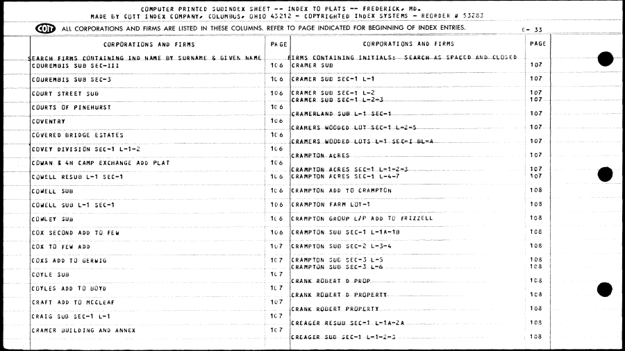 | .... < £AJS-CH~ Jf 1 a&S £0&I AlULHfi^lJiD M AM £ BY SiiR HAH £ & Gl V £ fi I4AHE COUREM81S SUB SEC-ill 1C6 COUREWBIS SU8 SEC-3 1C 6 | COURT STREET SUB I 106 j COURTS OF PINEHURST | 106 _._..........-.....-.-........-_...._._..................._..._.__... _...-....__._...._....... .... .. ..................,..._.._............... . .......... ....... ....................... ... j. ........... COVENTRY 106 COVERED BRIDGE ESTATES ! 1C6 COVET DIVISION SEC-1 L-1-2 106 COWAN £ 4H CAMP EXCHANGE ADD PLAT 106 COWELL RESUB L-1 SEC-1 116 COWELL SUB 1C 6 COWELL SUB L-1 SEC-1 106 COWLEY SU8 1t6 COX SECOND ADD TO FEW 106 COX TO FEW ADD 1u7 COXS ADD TO GE8WIG j 1C7 CQYLE SUB j U7 CQYLES ADD TO BOYD 1C 7 .\ . ... ................ .... ...... .... .............. .... .. ; CRAFT ADD TO MCCLEAF ; 107 CRAIG SUB SEC-1 L-1 1C7 CRAMER BUILDING AND ANNEX 107 I i I IRKS CXXtiTAXNXNG .UiX-TlALS^~ S-EAJ8-Ctt~~A-S SPACEa A!iIX-~CL03£D CRAMER SUB I 107 ____.__.._.__._._._._._.._.._...__.........._____________.._._.__......... .. . . .1. ........ CRAMER SUB SEC-1 L-1 ! 107 CRAMER SUB SEC-1 L-2 I 107 ...... C« *«£*.--S4^e.-..5^C^t.--L=--2--=J-------~---..----.-.--____-__......__._._.- ........... ... . i.107-.-. CRAMERLAWD^ 5UB...L«1__S£O4-. -..-...-... i 107 CRAHEas WOCOED..-UII_i£Csit..-L=2=5-____._...-....__.-.. i 107 C RAMEfiS- WO.OaED. LilTS.-1_=1 SE^O^J&L-A^- .-... - , 10 7 ... CAAHP-TOIi-A4A£S- ..-...----._._.__-... -.--..- . ..... i 1 0? CRAJJPIOW AR£S S£C^1 4_=t=2-!-i.-.-.._-_.._...._......-...... i 1C? CRAMPTON ACRES SEC-1 L-4-7 107 CRAMPTON ADD TO CRAMPTON 108 CRAMPTON FARM LOT-1 108 CRAMPTON GROUP L/P ADD TO FRIZZELL 108 CRAMPTON SUB SEC-1 L-1A-18 108 CRAMPTON SUB SEC-2 L-3-4 108 CRAMPTON SUB SEC-3 L-5 108 CRAMPTON SUB S£-3 L-6.............._...._.._.__._......... 108 CRANK ROBERT D P&OP-.--..-.. .......-.-.-._._........ 103 CRANK ROBtRT D PROPERTY- _ 1C8 CRANK ROBERT PROPE-RTY .. 10B IcREAGER-.RtSUO ££4-1 L=1A-2A ............ - 108 . CR£-AG..£R....$U6.-3£C-l--L-a-2^a -.-..-...-.-......-...- -. - - ,108 |