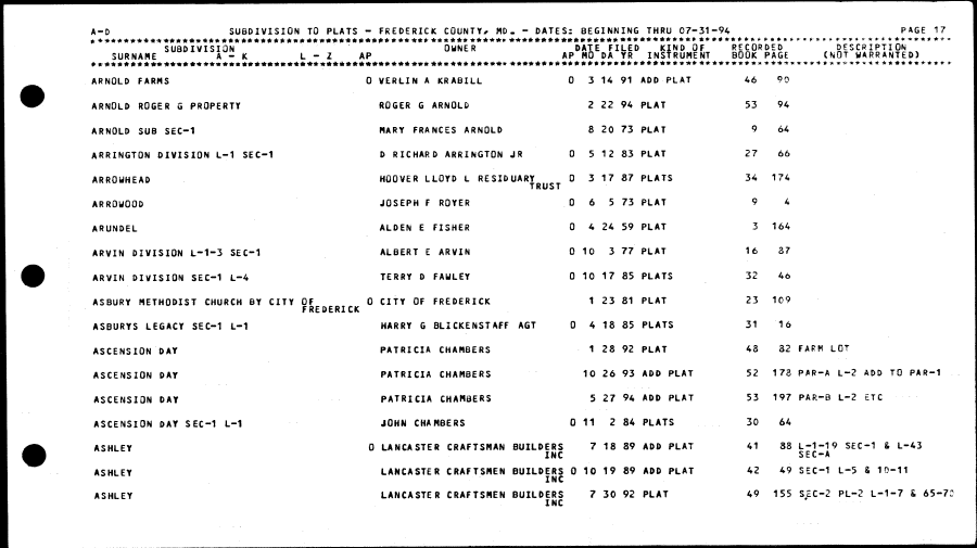 | ARNOLD FARMS 0 VERLIN A KRABILL 0 3 14 91 ADO PLAT 46 90 ARNOLD ROGER 6 PROPERTY ROGER G ARNOLD 2 22 94 PLAT 53 94 ARNOLD SUB SEC-1 MARY FRANCES ARNOLD 8 20 73 PLAT 9 64 ARRINGTON DIVISION L-1 SEC-1 D RICHARD ARRINGTON JR 0512 83 PLAT 27 66 ARROyHEAD HOOVER LLOYD L RESIDUARY 0 3 17 87 PLATS 34 174 TRUST ARROyOOD JOSEPH F RQYER 0 6 5 73 PLAT 9 4 ARUNDEL ALDEN E FISHER 0 4 24 59 PLAT 3 164 ARVIN DIVISION L-1-3 SEC-1 ALBERT £ ARVIN 0103 77 PLAT 16 87 ARVIN DIVISION SEC-1 L-4 TERRY D FAyLEY 0 10 17 85 PLATS 32 46 ASBURY METHODIST CHURCH BY CITY OF 0 CITY OF FREDERICK 1 23 81 PLAT 23 109 FREDERICK ASBURYS LEGACY SEC-1 L-1 HARRY G BLICKENSTAFF AGT 0 4 18 85 PLATS 31 16 ASCENSION DAY PATRICIA CHAMBERS 1 28 92 PLAT 48 82 FARM LOT ASCENSION DAY PATRICIA CHAMBERS 10 26 93 ADD PLAT 52 178 PAR-A L-2 ADD TO PAR-1 ASCENSION DAY PATRICIA CHAMBERS 5 27 94 ADD PLAT 53 197 PAR-B L-2 ETC ASCENSION DAY SEC-1 L-1 JOHN CHAMBERS 0 11 2 84 PLATS 30 64 ASHLEY 0 LANCASTER CRAFTSMAN BUILDERS 7 18 89 ADD PLAT 41 88 L-1-19 SEC-1 & L-43 INC SEC-A ASHLEY LANCASTER CRAFTSMEN BUILDERS 0 10 19 89 ADD PLAT 42 49 SEC-1 L-5 S 10-11 INC ASHLEY LANCASTER CRAFTSMEN BUILDERS 7 30 92 PLAT 49 155 SEC-2 PL-2 L-1-7 & 65-70 INC |