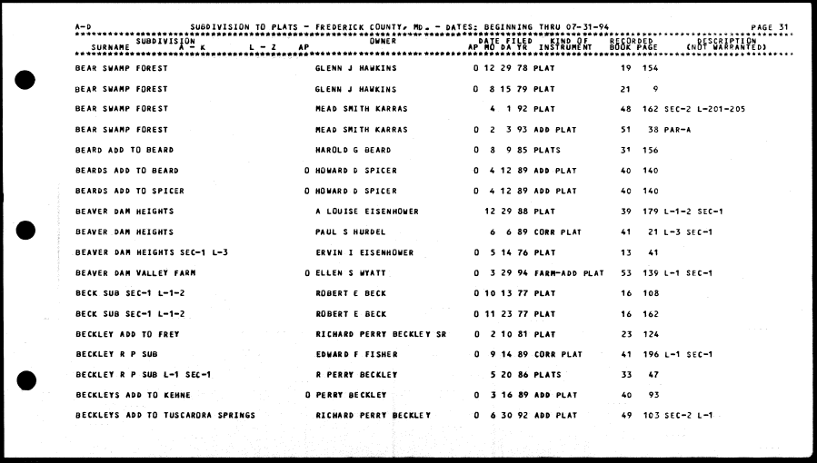 | BEAR SWAMP FOREST GLENN J HAWKINS 0 12 29 78 PLAT 19 154 BEAR SWAMP FOREST GLENN J HAWKINS 0 8 15 79 PLAT 21 9 BEAR SWAMP FOREST MEAD SMITH KARRAS 4 1 92 PLAT 48 162 SEC-2 L-201-205 BEAR SUAMP FOREST MEAD SMITH KARRAS 0 2 3 93 ADD PLAT 51 38 PAR-A BEARD ADD TO BEARD HAROLD G BEARD 0 8 9 85 PLATS 31 156 BEARDS ADD TO BEARD 0 HOWARD D SPICER 0 4 12 89 ADD PLAT 40 140 BEARDS ADD TO SPICER 0 HOWARD D SPICER 0 4 12 89 ADD PLAT 40 140 BEAVER DAM HEIGHTS A LOUISE EISENHOWER 12 29 88 PLAT 39 179 L-1-2 SEC-1 BEAVER DAM HEIGHTS PAUL S HURDEL 6 6 89 CORR PLAT 41 21 L-3 SEC-1 BEAVER DAM HEIGHTS SEC-1 L-3 ERVIN I EISENHOWER 0 5 14 76 PLAT 13 41 BEAVER DAM VALLEY FARM 0 ELLEN S WYATT 0 3 29 94 FARM-ADD PLAT 53 139 L-1 SEC-1 BECK SUB SEC-1 L-1-2 ROBERT E BECK 0 10 13 77 PLAT 16 108 BECK SUB SEC-1 L-1-2 ROBERT E BECK 0 11 23 77 PLAT 16 162 BECKLEY ADD TO FREY RICHARD PERRY BECtCLEY SR 0 2 10 81 PLAT 23 124 BECKLEY R P SUB EDWARD F FISHER 0 9 14 89 CORR PLAT 41 196 L-1 SEC-1 BECKLEY R P SUB L-1 SEC-1 R PER BY BECKLEY 5 20 86 PLATS 33 47 BECKLEYS ADD TO KEHNE 0 PERRY 8ECKLEY 0 3 16 89 ADD PLAT 40 93 BECKLEYS ADD TO TUSCARORA SPRINGS RICHARD PERRY BECKLEY 0 6 30 92 ADD PLAT 49 103 SEC-2 L-1 |