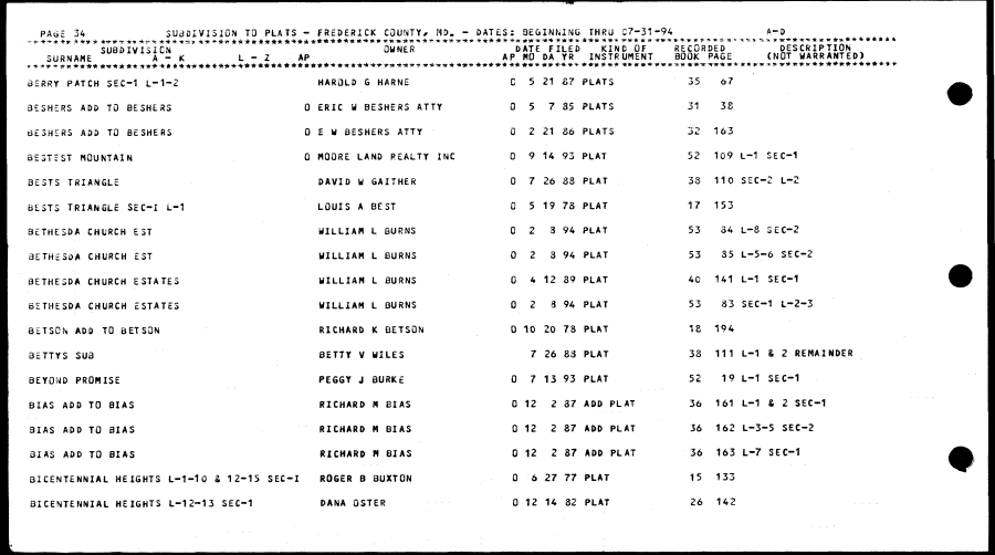 FREDERICK COUNTY CIRCUIT COURT (Plat Book, Index) 1907-1994 MSA C2320-1MSA C2320-1, Image No: 79 Enlarge and print image (60K) |