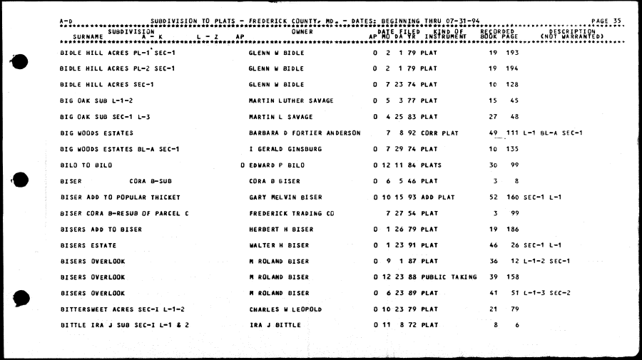 | BIDLE HILL ACRES PL-1*SEC-1 GLENN W BIOLE 0 2 1 79 PLAT 19 193 BIDLE HILL ACRES PL-2 SEC-1 GLENN W BIBLE 0 2 1 79 PLAT 19 194 BIDLE HILL ACRES SEC-1 GLENN W BIOLE 0 7 23 74 PLAT 1C 128 BIG OAK SUB L-1-2 HARTIN LUTHER SAVAGE 0 5 3 77 PLAT 15 45 BIG OAK SUB SEC-1 L-3 MARTIN L SAVAGE 0 4 25 83 PLAT 27 48 BIG WOODS ESTATES BARBARA D FORTIER ANDERSON 7 8 92 CORR PLAT 49 111 L-1 BL-A SEC-1 BIG WOODS ESTATES BL-A SEC-1 I GERALD GINSBURG 0 7 29 74 PLAT 10 135 SILO TO 8ILO 0 EDWARD P BILO 0 12 11 84 PLATS 30 99 BISER CORA 8-SUB CORA B bISER 0 6 5 46 PLAT 3 S BISER ADO TO POPULAR THICKET GARY HELVIN BISER 0 10 15 93 ADD PLAT 52 160 SEC-1 L-1 BISER CORA B-RESUB OF PARCEL C FREDERICK TRADING CO 7 27 54 PLAT 3 99 3ISERS ADD TO BISER HERBERT H BISER 0 1 26 79 PLAT 19 186 BISERS ESTATE WALTER H BISER 0 1 23 91 PLAT 46 26 SEC-1 L-1 8ISERS OVERLOOK H ROLAND BISER 0 9 1 87 PLAT 36 12 L-1-2 SEC-1 BISERS OVERLOOK M ROLAND BISER 0 12 23 88 PUBLIC TAKING 39 153 BISERS OVERLOOK H ROLAND BISER 0 6 23 89 PLAT 41 51 L-1-3 SEC-2 BITTERSWEET ACRES SEC-I L-1-2 CHARLES W LEOPOLD 0 tO 23 79 PLAT 21 79 B1TTLE IRA J SUB SEC-I L-1 £ 2 IRA J BITTLE 0 11 8 72 PLAT 8 6 |