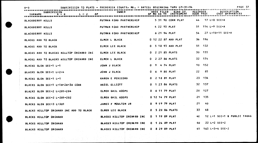 | BLACKBERRY HILLS POTMAN ROAD PARTNERSHIP 5 31 90 CORR PLAT 44 17 L-8 SEC-A BLACKBERRY HILLS PUTMAN ROAD PARTNERSHIP 4 22 93 PLAT 51 114 L-9 SEC-A BLACKBERRY HILLS PUTMAN ROAD PARTNERSHIP 6 21 94 PLAT 54 27 L-10-11 SEC-A BLACKS ADD TO BLACK ELMER L SLACK 0 12 22 37 ADD PLAT 36 196 BLACKS ADD TO BLACK ELMER LEE BLACK 0 5 18 93 ADD PLAT 51 132 BLACKS ADD TO BLACKS HILLTOP ORCHARD INC ELMER LEE BLACK 0 2 21 85 PLATS 30 155 BLACKS ADD TO BLACKS HILLTOP ORCHARD INC ELMER L SLACK 0 2 27 86 PLATS 32 174 BLACKS GLEN SEC-1 L-1 JOHN J BLACK 094 74 PLAT 10 152 BLACKS GLEN SEC-1 L-2-4 JOHN J BLACK 0 6 9 80 PLAT 22 85 BLACKS GLEN SEC-1 L-1 KAREN £ PEDICORD 0 2 18 81 PLAT 23 134 BLACKS GLEN SEC-1 L-1A-2A-3A CORR HAZEL ELLIOTT 0 1 23 86 PLATS 32 137 BLACKS GLEN SEC-2 L-201-204 ELMER SAIL KOOPS 0 6 11 79 PLAT 20 127 BLACKS GLEN SEC-2 L-201-202 ELMER GAIL KOOPS 0 12 14 79 PLAT 21 135 BLACKS GLEN SEC-3 L-301 JAMiS F MOULTQN JR 0 9 19 79 PLAT 21 40 BLACKS HILLTOP ORCHARD INC ADD TO BLACK ELMtR LEE BLACK 0 S 20 86 PLATS 33 48 BLACKS HILLTOP ORCHARD BLACKS HILLTOP ORCHARD INC 0 1 19 89 PLAT 40 12 L-1 SEC-1 & PUBLIC TAKNG BLACKS HILLTOP ORCHARD BLACKS HILLTOP ORCHARD INC 0 1 24 89 PLAT 40 22 L-2 SEC-2 BLACKS HILLTOP ORCHARD BLACKS HILLTOP ORCHARD INC 0 8 29 89 PLAT 41 163 L-3-4 SEC-2 |