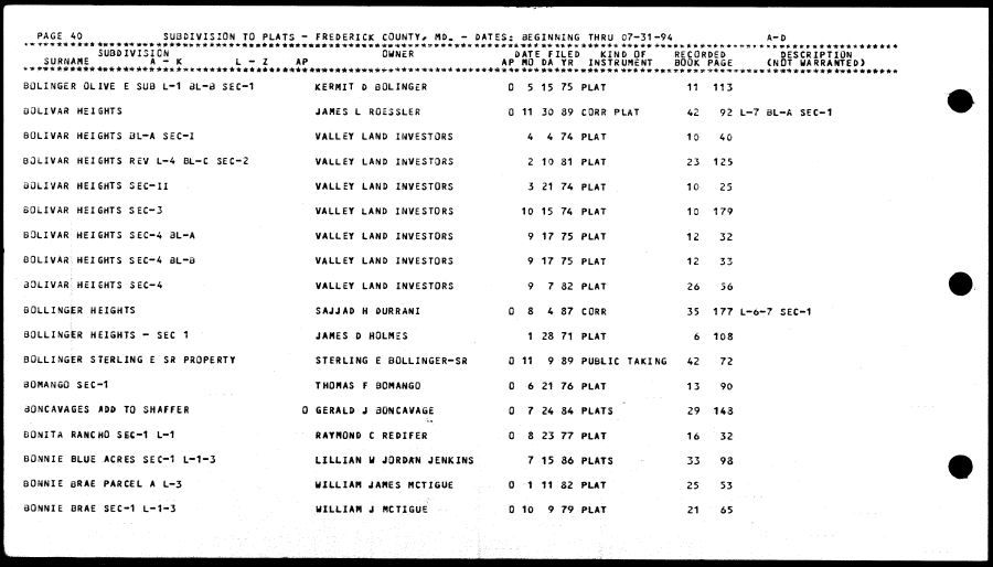 | BQLINGER OLIVE E SUB L-1 BL-8 SEC-1 KERMIT D BQLINGER 0 5 15 75 PLAT 11 113 OQLIVAR HEIGHTS JAMES L ROE3SLER 0 11 30 89 CORR PLAT 42 92 L-7 BL-A SEC-1 BOLIVAR HEIGHTS BL-A SEC-I VALLEY LANS INVESTORS 4 4 74 PLAT 10 40 BOLIVAR HEIGHTS REV L-4 BL-C SEC-2 VALLEY LAND INVESTORS 2 10 81 PLAT 23 125 80LIVAR HEIGHTS SEC-II VALLEY LAND INVESTORS 3 21 74 PLAT 10 25 BOLIVAR HEIGHTS SEC-3 VALLEY LAND INVESTORS 10 15 74 PLAT 10 179 BOLIVAR HEIGHTS SEC-4 3L-A VALLEY LAND INVESTORS 9 17 75 PLAT 12 32 BOLIVAR HEIGHTS SEC-4 3L-B VALLEY LAND INVESTORS 9 17 75 PLAT 12 33 30LIVAR HEICHTS SEC-4 VALLEY LAND INVESTORS 9 7 32 PLAT 26 56 BQLLINGER HEIGHTS SAJJAD H DURRANI 0 8 4 87 CORK 35 177 L-6-7 SEC-1 SQLLINGlR HEIGHTS - SEC 1 JAMES 0 HOLMES 1 28 71 PLAT 6 108 BOLLINGER STERLING £ SR PROPERTY STERLING E BOLLINGER-SR 0 11 9 89 PUBLIC TAKING 42 72 80HANGQ SEC-1 THOMAS F SOMAM6Q 0 6 21 76 PLAT 13 90 dONCAVAGES ADO TO SHAFFER 0 6E8AL& J 30NCAVASE 0 7 24 84 PLATS 29 143 '«,* BONITA RANCHO SEC-1 L-1 RAYWONB C REDIFER 0 8 23 77 PLAT 16 32 80NNIE BLUE ACRES SEC-1 L-1-3 LILLIAN tf JORDA-fi JENKINS 7 15 86 PIATS 33 98 BOMNIE BRAE PARCEL A L-3 WILLIAM JAHfS MCTIGUE 0 1 11 S2 PLAT 25 53 90NNIE BRAE SEC-1 L-1-3 HILLIAM J MCTIGUE 0 10 9 79 PLAT 21 65 |