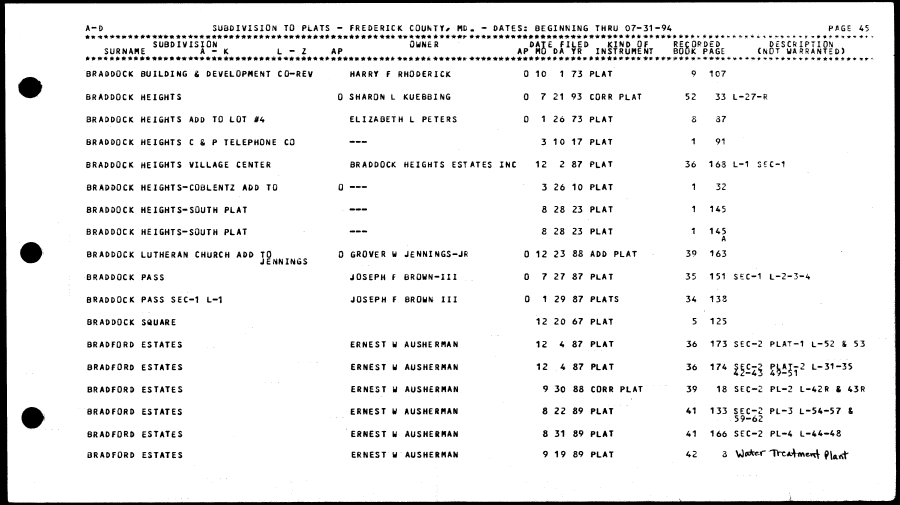 FREDERICK COUNTY CIRCUIT COURT (Plat Book, Index) 1907-1994 MSA C2320-1MSA C2320-1, Image No: 90 Enlarge and print image (58K) |
