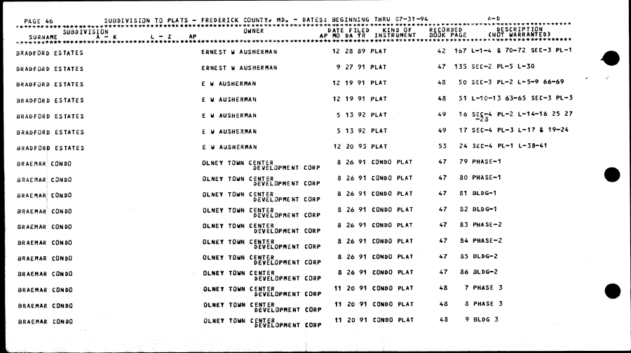 FREDERICK COUNTY CIRCUIT COURT (Plat Book, Index) 1907-1994 MSA C2320-1MSA C2320-1, Image No: 91 Enlarge and print image (77K) |