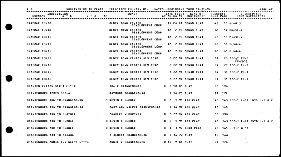 FREDERICK COUNTY CIRCUIT COURT (Plat Book, Index) 1907-1994 MSA C2320-1MSA C2320-1, Image No: 92 Enlarge and print image (62K) |