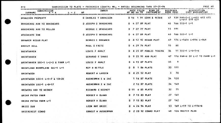 | 8RANISON PROPERTY 0 CHARLES T BRANISON 0 10 1 91 CORR S, R£SUB 47 139 PAR-1-2 L-411 413 415 L-417 419 421 3RASHEARS ADO TO BRASHEARS 0 JOSEPH 0 BRASHEARS 0 4 27 89 PLAT 40 166 SEC-1 L-1 8RASHEARS ADD TO MILLER 6EORGE £ BRASHEARS 0 7 27 77 PLAT 15 191 BRASHEARS SUB 0 JOSEPH 0 BRASHEARS 0 4 27 89 PLAT 40 166 SEC-1 L-1 BRAyNER RESUB PLAT DENNIS £ BRAWNER 0 8 12 92 RESUB PLAT 49 174 L-160A L-99A L-94A BREEZY HILL PAUL 0 FRITZ 0 4 29 74 PLAT 10 68 BRENTHAVEN LOUIS T AHALT 0 8 25 87 PUBLIC TAKING 36 11 SEC-1 L-4-5-6 BRENTHAVEN SERAROO £ SANDI 0 9 25 91 ADD PLAT 47 116 PAR-A OF L-2 TO FARM L-1 BRENTHAVEN SEC-1 L-2-3 £ FARM L-1 LOUIS F AHALT 0 4 15 87 PLATS 35 9 BRENTLAND HERRYLAND SEC-1 L-1 ROY 0 BITTLE 0 8 1 86 PLATS 33 111 BRENTWOOD ROBERT W LARSEN 0 8 25 52 PLAT 3 78 BRENTWOOD SEC-1 L-1-7 & 13-20 AUSHERMAN E U INC 1 16 87 PLATS 34 128 BRENTWOOD SEC-1 L-8-17 AUSHERNAN E U INC 2 10 87 PLATS 34 149 BREWERS ADD TO KEENEY RICHARD C KEEHEY 011 6 85 PLATS 32 71 BRIAR PATCH FARM DORSET A OLAND 0 7 15 83 PLAT 27 141 BRIAR PATCH FARM L-1 DORSET A OLAND 0 7 15 83 PLAT 27 142 BRICE SUB LEOM RAY BftICE 0 4 26 94 PLAT 53 169 L-19 TO L-19A-B BRIERCREST CON00 ERNEST tf AUSHEHHAW 0 2 28 92 CON60 PLAT 48 126 MASTER PLAN |
