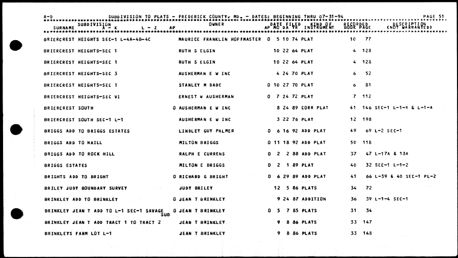 FREDERICK COUNTY CIRCUIT COURT (Plat Book, Index) 1907-1994 MSA C2320-1MSA C2320-1, Image No: 96 Enlarge and print image (63K) |