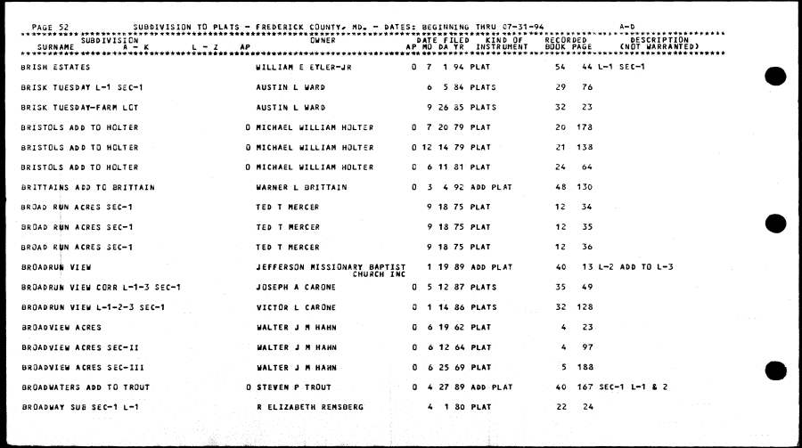 | BRISH ESTATES WILLIAM E EYLER-JR 0 7 1 94 PLAT 54 44 L-1 SEC-1 BRISK TUESDAY L-1 SEC-1 AUSTIN L WARD 6 5 84 PLATS 29 76 BRISK TUESDAY-FARH LOT AUSTIN L WARD 9 26 85 PLATS 32 23 BRISTQLS ADO TO HQLTER 0 MICHAEL WILLIAM HQLTER 0 7 20 79 PLAT 20 173 BRISTOLS ADD TO HCLTER 0 MICHAEL WILLIAM HOLTER 0 t2 14 79 PLAT 21 138 BRISTOLS ADD TO HOLTER 0 MICHAEL WILLIAM HOLTER 0 6 11 31 PLAT 24 64 BRZTTAINS ACU TO BRITTAIN WARNER L SRITTAIN 0 3 4 92 ADD PLAT 48 130 8ROA0 RUN ACRES SEC-1 TED T HERCER 9 18 75 PLAT 12 34 BROAD RUN ACRES SEC-1 TED T HERCER 9 13 75 PLAT 12 35 BROAD RUN ACRES 3EC-1 TED T MERCER 9 18 75 PLAT 12 36 BROADRUl VIEW JEFFERSON MISSIONARY BAPTIST 1 19 89 ADD PLAT 40 13 L-2 ADD TO L-3 CHURCH INC BROADRUN VIEW CORR L-1-3 SEC-1 JOSEPH A CARONE 0 5 12 87 PLATS 35 49 BROADRUN VIEW L-1-2-3 SEC-1 VICTOR L CARONE 0 1 14 86 PLATS 32 128 3RQADVIEW ACRES WALTER J M HAHN 0 6 19 62 PLAT 4 23 BROADVIEW ACRES SEC-II WALTER J M HAHN 0 6 12 64 PLAT 4 97 8SQAOVIEW ACRES SiC-III WALTER J ft HAHN 0 6 25 69 PLAT 5 133 BROADWATERS ADD TO TROUT 0 ST6VEN P TROUT 0 4 27 89 ADD PLAT 40 167 SEC-1 L-1 & 2 BROADWAY SUB SEC-1 L-1 R ELIZABETH REMSBERG 4 1 80 PLAT 22 24 |