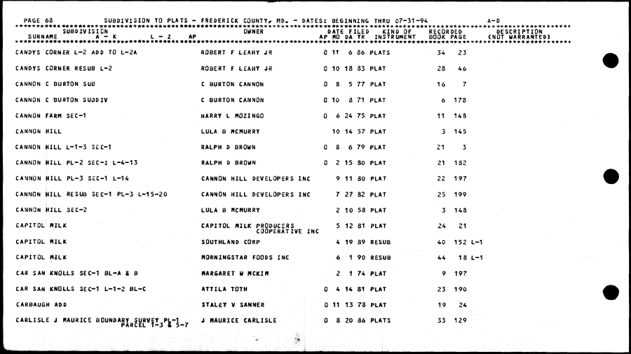 FREDERICK COUNTY CIRCUIT COURT (Plat Book, Index) 1907-1994 MSA C2320-1MSA C2320-1, Image No: 113 Enlarge and print image (65K) |
