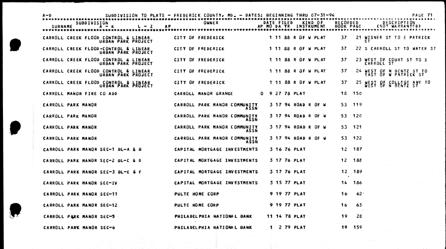 | CARROLL CREEK FLOOD CONTROL £ LINEAR CITY OF FREDERICK 1 11 88 R OF U PLAT 37 21 WISNER ST TO £ PATRICK URBAN PARK PROJECT ST CARROLL CREEK FLOOD-CONTROL & LINEAR CITY OF FREDERICK 1 11 88 R OF W PLAT 37 22 S CARROLL ST TO WATER ST URBAN PARK PROJECT CARROLL CREEK FLOOD CONTROL & LINEAR CITY OF FREDERICK 1 11 88 R OF W PLAT 37 23 WEST OF COURT ST TO S URBAN PARK PROJECT CARROLL ST CARROLL CREEK FLOOD CONTROL 4 LINEAR CITY OF FREDERICK 1 11 88 R OF U PLAT 37 24 yEST OF N 8ENT2 ST TO URBAN PARK PROJECT EAST OF U PATRICK ST CARROLL CREEK FLOOD CONTROL & LINEAR CITY OF FREDERICK 1 11 88 R OF W PLAT 37 25 WEST OF COLLEGE AVf TO URBAN PARK PROJECT WEST OF N BENTZ ST CARROLL MANOR FIRE CO ADD CARROLL MANOR GRANGE 0 9 27 73 PLAT 13 150 CARROLL PARK MANOR CARROLL PARK MANOR COMMUNITY 3 17 94 ROAD R OF U 53 119 ASSN CARROLL PARK MANOR CARROLL PARK MANOR COMMUNITY 3 17 94 ROAD R OF W 53 120 ASSN CARROLL PARK MANOR CARROLL PARK MANOR COMMUNITY 3 17 94 ROAD R OF W 53 121 ASSN CARROLL PARK MANOR CARROLL PARK MANOR COMMUNITY 3 17 94 ROAD R OF W 53 122 ASSN CARROLL PARK MANOR SEC-1 BL-A g B CAPITAL MORTGAGE INVESTMENTS 3 16 76 PLAT 12 187 CARROLL PARK MANOR SEC-2 BL-C & D CAPITAL MORTGAGE INVESTMENTS 3 17 76 PLAT 12 188 CARROLL PARK MANOR SEC-3 BL-E & F CAPITAL MORTGAGE INVESTMENTS 3 17 76 PLAT 12 1S9 CARROLL PARK MANOR SEC-IV CAPITAL MORTGAGE INVESTMENTS 3 15 77 PLAT 14 186 CARROLL PARK MANOR SEC-11 PULTE HOME CORP 9 19 77 PLAT 16 62' CARROLL PARK MANOR SEC-12 POLTE HOME CORP 9 19 77 PLAT 16 63 CARROLL P48K MANOR SiC-S PHILADELPHIA NATIONAL BANK 1t 14 78 PLAT 19 28 CARROLL PARK MANOR SEC-6 PHILADELPHIA NATIONAL BANK 1 2 79 PLAT 19 159 |