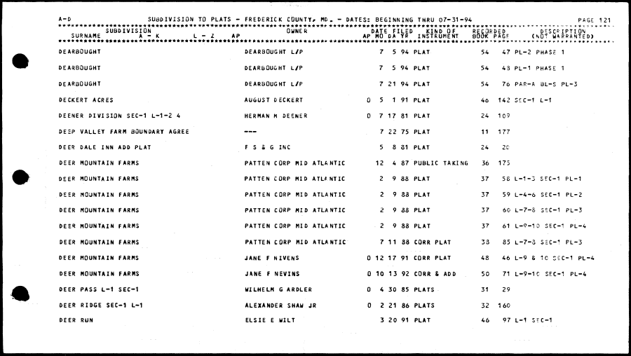 | OEAR80UGHT DEAR80UGHT L/P 7 5 94 PLAT 54 47 PL-2 PHASt 1 DEARBQUSHT DEARBOUGHT L/P 7 5 94 PLAT 54 43 PL-1 PHASE 1 OEARBOUGHT OEARBOUGHT L/P 7 21 94 PLAT 54 76 PAR-A BL-S PL-3 DECKERT ACRES AUGUST DECKERT 0 5 1 91 PLAT 46 142 S£C-t L-1 DEENER DIVISION SEC-1 L-1-2 4 HERMAN K DEENER 0 7 17 81 PLAT 24 109 OE£P VALLEY FARM 30UNOARY AGREE —— 7 22 75 PLAT 11 177 DEER DALE INN ADO PLAT F S & G INC 5 8 81 PLAT 24 20 DEER MOUNTAIN FARMS PATTEN CORP MID ATLANTIC 12 4 87 PUBLIC TAKING 36 175 DEER MOUNTAIN FARMS PATTEN CORP MID ATLANTIC 2 9 88 PLAT 37 58 L-1-3 SEC-1 PL-1 DEER MOUNTAIN FARMS PATTEN CORP MID ATLANTIC 2 9 83 PLAT 37 59 L-4-6 SEC-1 PL-2 DEER MOUNTAIN FARMS PATTEN CORP MID ATLANTIC 2 9 38 PLAT 37 60 L-7-8 SEC-1 PL-3 DEER MOUNTAIN FARMS PATTEN CORP MID ATLANTIC 2 9 88 PLAT 37 61 L-9-10 SEC-1 PL-4 DEER MOUNTAIN FARMS PATTEN CORP MID ATLANTIC 7 11 38 CORR PLAT 33 85 L-7-3 SEC-1 PL-3 DEER MOUNTAIN FARMS JANE F NIVENS 0 12 17 91 CORR PLAT 48 46 L-9 & 1C SEC-1 PL-4 DEER MOUNTAIN FARMS JANE F NEVIMS 0 10 13 92 CORR & ADD 50 71 L-9-1C SEC-1 PL-4 DEER PASS L-t SEC-1 WILHELM G ARDLER 0 4 30 85 PLATS 31 29 DEER RIDGE SEC-1 L-1 ALEXANDER SHAW JR 0 2 21 36 PLATS 32 160 DEER RUN ELSIE £ WILT 3 20 91 PLAT 46 97 L-1 SEC-1 |