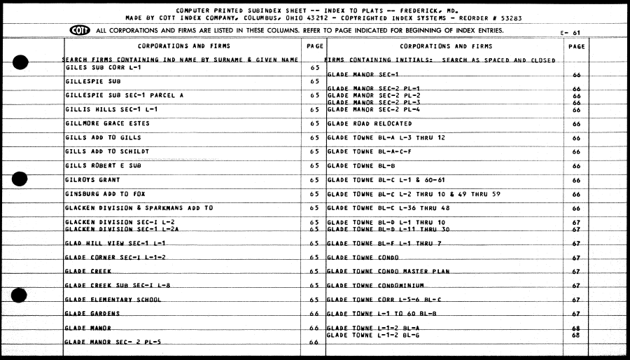 | ___J EARCH FIRMS CONTAINING IMP NAME BY SURNAME & GIVEN NAME_____ GILES SUB CORR L-1 65 GILLESPIE SUB 65 alLLESPir^uF~s¥c^l PARCEL^^5 GILLIS HILLS SEC-1 L-1 65 GILLMORE GRACE ESTES 65 GILLS ADO TO GILLS 65 GILLS AD£J TO SCHILOT ^y GILLS ROBERT E SUB 65 GILROYS GRANT 65 GINSBUR6 ADD TO FOX 65 GLACKEN DIVISION & SPARKMANS ADD TO 65 GLACKEN DIVISION SEC-I L-2 65 ___ GLACKEN DIVISION SEC-1 L-2A____________________________6JL _____ GLAD MILL VlfH SEC-1 L-1____________________________ 65 GLAOE CORNER SEC-I i-1-2______________________________65 GLADE CREEK __________________________________________ 65 __ fit APE CREEK SUfl SEC-I L-fl_____________________________6_5_ _____ GIAQE ELEMENTARY SCHOOL_____________________ 65 — 6LABE GARDENS___________________________&A_ __ Gt, *f>E MANOR________________________________________ 66 fiLAflg MAMOB SgC- 2 PL»S______________________________________6-6- J! IRHS CONTAINING INITIALS; SEARCH AS SP-ACED AND-XLOS£4)^ _____ __ GLADE MANOR SEC-1___________________________________..____66- _ GLADE MANOR SEC-2 PI-1_________________________._____.___^6- GLADE MANOR SEC-2 PL-2 66 _ GLADE MANOR SEC-2 PL-3_________________________.____.__.66- GLADE HANOR SEC-2 PL-4 66 GLADE ROAD RELOCATED 66 GLADE TOWNE BL-A L-3 THRU 12 66 GLADE TOHNE BL-A-C-F 66 GLADE TOUNE 8L-B 66 GLADE TOWNE BL-C L-1 S 60-61 66 GLADE TOyNE BL-C L-2 THRU 10 & 49 THRU 59 66 GLADE TOWNE BL-C L-36 THRU 48 66 GLADE TOUNE BL-0 L-1 THRU 10 6? _ GLADE TQWNF BL-D L-11 THRU 30__________________________61^ _ GLADg TOWNS BL-F L-1 THRU 7___________________________67 I _GLADE TOUNE CONPO_______________________________ 67 _GLADE TQMNE CQNDQ MASTER PLAN_____________________47 _61 APE TOMNE CONOriMINIUH_______________________________&£„ GLADE T.QUM6 CORR L-S-6 8L-C_________________________ 47 -.. _ GLADE TQHNE L-1 TO 60 BL-B____________________________&JL. _ GLADE TOUNE L-1-2 BL-A______________________________. fig GLADE TOHNE L-1-2 BL-G 68 |