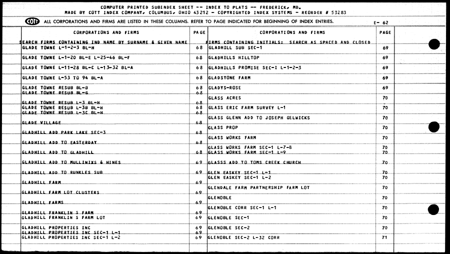 | SEARCH FIRMS CONTAINING IMP NAME BY SURNAME & GIVEN NAME____ 6LABE TOMNE L-1-2-3 BL-H 68 6LABE TOWNE L-1-20 BL-E L-25-46 BL-F68 GLADE TQHNE L-11-28 BL-C L-1 3-32 BL-A 68 GLADE TOWNE L-53 TO 94 BL-A 68 GLADE TOWNE RESUB 8L-0 68 GLADE TOUNE RESUB BL-G__________________________________6-8- ___ GLAQE TQMNg BESUB t-3 et-H______________________ 68 GLADE TOWNE RESUB L-3B BL-H 68 __ 6LAPE TQUNE RESLJB L-3C BL-H______________________________6-8- _ Si ABi VIU.A6C_______________________________________6A-__ GLADHILL ADD PARK. LAKE SEC~3_____________________________ 68 ___ GLADHILL ADD TO EASTERDAY_______________________________6A __ GLAPHILL ADO TO GLADHILL_________________________________6J8_ __ QLADHILL APP TO HULLINIXS A HINES______________________43^ —— GLAQHILL ADD TO RUNKLES SUB_____________________________dS_ __ &LAAMILL FARM________________________________________65_ ___ GLADHILL -FJULILJJiX_jCAJiSI£&S____________________________6A-___ GLAPHILL FARMS__________...____________________________69 __ GLAPHILL FRANKLIN S FASH______________________________ 69 GLADHILL FRANKLIN S FARM LOT 69 GLADHILL PROPERTIES INC 69 _ 6LAOMILL-£JUtfE.BTl£S INC S-EC-Jt L«t______________________6Jft- GLADHILL PROPERTIES INC SEC-1 L-2 69 IRHS CONTAINING INITIALS; SEARCH AS SPACED AND CLOSED______ GLADHILL SUB SEC-1 69 GLADHILLS HILLTOP 69 GLADHILLS PROMISE SEC-I L-1-2-3 69 GLADSTONE FARM 69 GLADYS-ROSE 69 GLASS ACRES 70 GLASS ERIC FARM SURVEY L-1 70 GLASS GLENN ADD TO JOSEPH GELWICKS 70 GLASS PROP 70 GLASS WORKS FARM 70 GLASS WORKS FARM SEC-1 L-7-8 70 GLASS WORKS FARM SEC-1 L-9__________________________.JUL_ 6LASSS ADD TQ TQMS CREgJC CHURCH_____________________ JTQ GLEN EASKEY SEC-1 L-1_________________________-_—._.___.—_20— GLEN EASKEY SEC-1 L-2 70 GLENDALE FARM PARTNERSHIP FARM LOT 70 GLENOBLE 70 GLENOBLE CORR SEC-1 L-1 70 GLENOBLE SEC-1 70 GLENOBLE SEC-2 70 GLENOBLE SEC-2 L-32 CORR 71 |