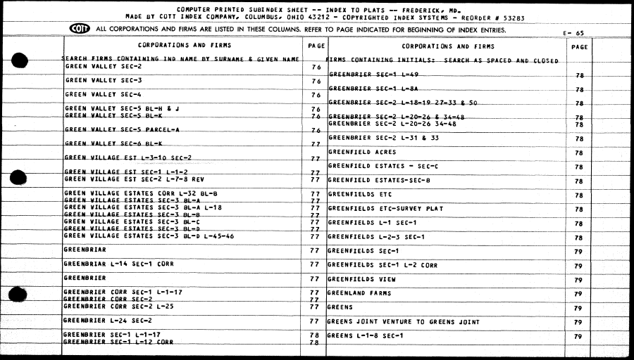| __: EARCH FIRMS CONTAINING INQ NAME BY SURNAME & GIVEN NAME______ GREEN VALLEY SEC-2 76 GREEN VALLEY SEC-3 76 GREEN VALLEY SEC-4 76 GREEN VALLEY SEC-5 BL-H & J 76 __ GREEN VALLEY SEC-5 BL-K_______________________________7-6- __ GREEN VALLEY SEC-5 PARCEL-A_________________________ 76 __ GREEN VALLEY SFC-6 Bl-K_______________________________7_7__ __ GREEN VILLAGE EST L-3-1Q SEC-2_________________________7J7— __ GREEN VILLAGE EST SEC-1 1-1*2_________________________7-Z-GREEN VILLAGE EST SEC-2 L-7-8 REV 77 GREEN VILLAGE ESTATES CQRR L-32 BL-B 77 __ GREEN VILLAGE ESTATES SEC-3 8L-A_______________________7-7— GREEN VILLAGE ESTATES SEC-3 8L-A L-18 77 __6REEN VILLAGE ESTATES SEC-3 BL-B______________________77 SREEN VILLAGE ESTATES SEC-3 BL-C 77 _ GREEN VILLAGE ESTATES SEC-3 BL-0______________________77 GREEN VILLAGE ESTATES SEC-3 BL-0 L-45-46 77 GREEN8RIAR 77 6REEN8RIAR L-14 SEC-1 CORR 77 GREENBRIER 77 GREENBRIER CORR SEC-1 L-1-17 77 __GREENSRIFR CORR SEC-2_________________________________77 GREEN8RIER CORR SEC-2 L-25 77 GREEN8RIER L-24 SEC-2 77 SREEMBR1ER SEC-1 L-1-17 78 — SBEEMBBfEB SEC-1 L-1 2 CORR____________________________2L8_ JIfiHS CONTAINING INITIALS: SEARCH AS SPACEP AND CLOSED _ - GREENBRIER SEC-1 L-49—————————————————————————— ___ —-?«-_&REENBRIER SEC-1 L-8A————————————————————————_._...„_____^4_ _GREENBRIES SEC-2 L-18-19 27-33 & SO——————______ __ J^ -GREENBRIER SEC-2 L-20-26 & 34-48—————————————————___—71- GREENBRIER SEC-2 L-20-26 34-48 78 GREENBRIER SEC-2 L-31 ft 33 78 GREENFIELO ACRES 78 GREENFIELD ESTATES - SEC-C 78 GREENFIELD ESTATES-SEC-B 78 GREENFIELDS ETC 78 GREENFIELDS ETC-SURVEY PLAT 78 GREENFIELDS L-1 SEC-1 78 GREENFIELDS L-2-3 SEC-1 78 GREENFIELDS SEC-1 79 GREENFIELDS SEC-1 L-2 CORR 79 GREENFIELDS VIEW 79 GREENLAND FARMS 79 GREENS 79 GREENS JOINT VENTURE TO GREENS JOINT 79 GREENS L-1-8 SEC-1 79 |