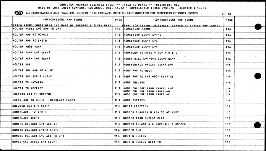 | SEARCH FIRMS CONTAINING IMP NAME BY SURNAME & GIVgN NAME HQLTER ACRES L-2 ADD TO L-1 112 HOLIER AOO TO MORRIS 112 HOLIER ADO TO SMITH 113 HOLIER AMOS FARM 113 HOLTER FARM L-1 SEC-1 113 HOLTER FARM L-2 SEC-1 113 HOLTER SUB 113 HOLTER SUB ADD TO A LOT 113 HOLTER SUB SEC-1 L-1-2 113 HOLTER TO HAYWARD 113 HOLTER TO JEFFREY 113 HQLTERS A60 TO BRISTOL 113 HOLT2 ADO TO HOLT2 - HIGHLAND FARMS 113 HOLWECK SUB L-1 SEC-1 113 HONEPLACE L-2 SEC-2 113 HOMEPLACE SEC-1 113 HOMERS DELIGHT L-1 SEC-H 113 HOMERS DELIGHT L-1-2 SEC-I 114 HOMERS DELIGHT L-2 ADD TO L-1 114 HOMESTEAD ACRES L-1 SEC-1 114 IftMS CQMTAIM1M6 INITIALS; SCAfiCH AS SPACFD AMD CLOSED______ HOMESTEAD FARMS 114 HOMESTEAD SEC-1 L-1-2 114 HOMESTEAD SEC-1 L-3 114 HOMESTEAD SEC-1 L-4 114 HOMEHQOD ESTATES - BL- A 8 & C 114 HONEY HILL L-1-2-3 SEC-1 8L-A 114 HONEYSUCKLE VALLEY SEC-1 L-1 114 HOOD ADD TO HOOD 114 HOOD ADD TO L-2 HOOD ESTATES 114 HOOD COLLEGE 114 HOOO COLLEGE FARM PARCEL C-2 114 HOOP COLLEGE FARM PARCEL-B____________________ _ — 444- HOOD COLLEGE FARM PARCEL-C 114 HOOD ESTATES 114 HOODS ADDITION 114 HOOPER CHARLES W ADD TO Ml AIRY 115 HOOPER FARM OUTLOT PLAT 115 HOOPER ROLAND W & MARSHALL F HOOPER 115 HOOPER SUB 115 HOOT N HOLLOW 115 HOOT N HOLLOW NEXT TO 115 |