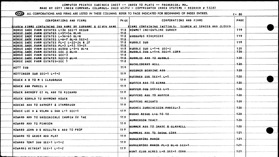 | !£AggM flRMS gOMT^IMIMfi IMP NAME S₯ SURNAME & GI tfEM MAKE HORSE SHOE FARM ESTATES L-3A SEC-1 RESU8 118 HORSE SHOE FARM ESTATES L-51-54 BL-B_________________ 118 HORSE SHOE FARM ESTATES L-56-65 BL-B 11 8 HORSI SHOE FARM ESTATES L-6-7 BL-0 SEC-2_______________14-& HORSE SHOE FARM ESTATES PL-2 L-22-24 ft 27 118 HORSE SHOE FARM ESTATES PL-3 L-12 15-21______________--11 8 HORSE SHOE FARM ESTATES RESU8 L-3-4 8L-A 118 __ HORSE SHOE FARM ESTATES-SEC 3 BL-D____________________U* HORSE SHOE FARM ESTATES SEC-3 118 HORSE SHOE FARM ESTATES SEC-3 BL-D___________________ 118 HORSE SHOE FARM ESTATES-SEC 1 118 HOTT SUB 119 HQTTINGER SUB SEC-1 L-1-2 119 HQUCK A B TO M S CLAUBAUGH 119 HOUCK ADD PARCEL A 119 HOUCK DAYHQFF ET AL ADO TO RICHARD 119 HOUCK GERALD TO RAYMOND HOUCK 119 HOUCKS ADD TO DAYHOFF & STAMBAUSH 119 HOUSE LEE A & VELMA 6 SU8 L-1 SEC-1 119 HOWARD ADD TO GROSSMCKLE CHURCH OF THE 119 HOWARD ADD TO PEARSON 119 HOWARD JOHN 8 & ROSSLYN K ADD TO PROP 119 HOWARD TO SAVER ADD PLAT 119 HOWARD TONY SUB SEC-1 L-1-2 119 HOWARDS RETREAT SEC-1 L-1-2 119 _J TPMS rflMTATMTMf. T»|TTyALS? SfABfH frS SPACFft AMR f» fK * B_______ HOWMET INC-OUTLINE SURVEY 119 HUBBARDS RIVERSIDE 119 HUBBLE SUB 119 HUBBLE SUB L-1-4 SEC-I 120 _ HUBBLE SUB L-1-4 S6C-1 CORR14N> __ HUBBLES ADD TO HUBBLE «0- _ HUCKLEBERRY HILL__________________________________1-ZO HUEBNER BERDINE A^XO_______WO _HUEBNER SUE SEC-1 L-1______________________________._4_2l> _ HUFFER ADD TO KINNA_________________________________ 1 20 HUFFER SUB SEC-II L-1 __ --4-20 _ HUFFERS ADD JCXLJiUFFER________________________________-120 _ HUFFERS HEIGHTS_________________________________ 12O_ HUGHES SUBDIVISION PARCEL-3____________________ --WO _ HUGHS RESUS L-6 TO 10_ -WO-_HUMBERSON T&ACJ__________________________________-._ --WO--- HUMMER ADD TXX-^HAD£ & GLADHILL____.. .-WO- _ HU«H£RS-AOb TO SHE UK. CORR___ ___W1 HUN6ERFORD MANOR_____ _.WJ _ {UNGERFOfiD MANOR PL-3 BL-B SEC-1_____________________ _W4-_H-UNX CLUB ACRES L-8 -^££-1^ CORR___________ ___..__............._..__ 424 ^ |