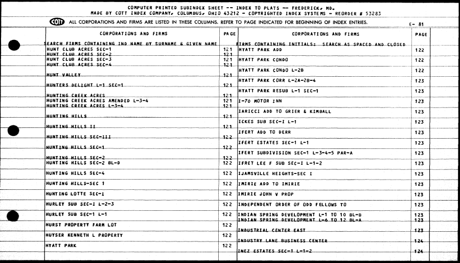 | _! gARCH FIRMS CQNTAIMIMG 1KB NAME BY $URMAME & GIMEM MAME______ HUNT CLUB ACRES SEC-1 121 - HUNT- ClUft ACRFS SEC-2__________________________________121 HUNT CLUB ACRES SEC-3 121 _ HUNT CLUB ACRES SEC-A_______________________________ 121 _ MAUm VALLEY____________________________________________121 __ HUNTgRS DELIGHT L-1 SEC-1_____________________________12-1 _ HUNTING CREEK ACRES______________________ 121 HUNTINS CREEK ACRES AMENDED L-3-4 121 _ HUNTING CRECK ACRES L-3-4____________________121 _ HUNTING HILLS____-~^^-^^^^^ ____________________42-1_ _ HUNTING HILLS II_____________________________________12Jl_ _ HUNTING HILLS SEC-III________________________________12-2 _ HUNTING HILLS SEC-1_________________________________ 122 - HUNTING HILLS SEC-2__________________________________122 HUNTING HILLS SEC-2 BL-0 122 HUNT1N6 HILLS SEC-4 122 HUNTING HILLS-SEC 1 122 HUNTING LOTTE SEC-I 122 HURLEY SUB SEC-I L-2-3 122 HURL!* SUB SEC-1 L-1122 HURST PROPERTY FARM LOT 122 HUYSER KENNETH L PROPERTY 122 HYATT PARK 122 TRHS CONTAINING INITIALS; SEARCH AS SPACED ftHD CLOSEP_ HYATT PARK ADO 122 HYATT PARK CQN0Q 122 HYATT PARK CONOQ L-2B 122 HYATT PARK CORR L-2A-2B-4 123 HYATT PARK RESUB L-1 SEC-1 123 1-70 MOTOR INN 123 IARICCI ADD TO GRIER & KINBALL 123 ICKES SUB SEC-I L-1 123 IFERT ADD TO DERR 123 IFERT ESTATES SEC-1 L-1 123 IFERT SUBDIVISION SEC-1 L-3-4-5 PAR-A 123 IFRET LEE F SUB SEC-I L-1-2 123 IJAHSVILLE HEIGHTS-SEC I 123 IMIRIE ADD TO IMIRIE 123 IMIRIE JOHN V PROP 123 INDEPENDENT ORDER OF ODD FELLOWS TO 123 INDIAN SPRING DEVELOPMENT L-1 TO 10 BL-B 123 INDIAN SPRING DEVELOPMENT L-6 TO 1? BL-A______________ 1-2-S. INDUSTRIAL CENTER EAST123 INDUSTRY LftNE BUSINESS CENTER________________________-124 INEZ ESTATES SEC-1 L-1-2124 |