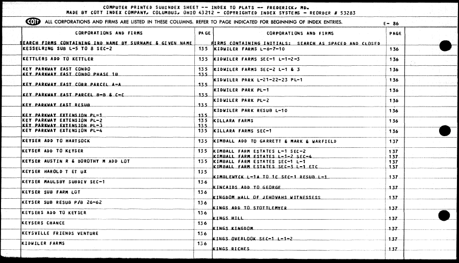 | 3 EARCM FIRMS CONTAINING IND NAME BY SURNAME & GIVEN NAME______ KESSELR1NS SUB L-5 TO 8 SEC-2 135 KETTLERS ADO TO KETTLER 135 KEY PARKWAY EAST CONDO 135 Keif PABKUIAY gAST COMBO PHASE 1B____________________________1?5 __ KET PARKWAY EAST CQRR PARCEL A-A_____________________ 155 KEY PARKWAY EAST PARCEL 8-B 4 C-C_____________________135 _ KEY PABKUAY EAST RgSUfl_____________________________________135 __ KEY PABKUAY EXTfMSIQM Pt-1__________________________________155 - KEY PARKWAY EXTENSION PL-2 135 _ KEY PARKWAY EXTENSION PL-3_________________________________135 KEY PARKWAY EXTENSION PL-4 135 KEYSER ADO TO HARTSOCK 135 ~~ KEYSER^IDD TlFlcEYsiRllT~ KEYSER AUSTIN R * DOROTHY M ADD LOT 135 KEYSER HAROLD T ET UX ~" 135 KEYSER HAULSBY SUBDIV SEC-1 136 KEYSER SUB FARM LOT 136 KEYSER SUB RESUO P/6 26-62 136 KEYSERS ADD TO KEYSER 136 KEYSERS CHANCE 136 KEYSVILLE FRIENDS VENTURE 136 KIDUILER FARMS 136 f JL8J1S CONTAINING INITIALS; SEARCH AS SPACED jyjJLJXO&O_______ KIDWILER FARMS L-6-7-10 136 KIDWILER FARMS SEC-1 L-1-2-3 136 KIDWILER FARMS SEC-2 L-1 & 3 136 KIDWILER PARK L-21-22-23 PL-1 136 KIDWILER PARK PL-1 136 KIDWILER PARK PL-2 136 KIDWILER PARK RESUB L-10 136 KILLARA FARMS 136 KILLARA FARMS SEC-1 136 KIMBALL ADD TO GARRETT & MARK £ WARFIELD 13? _ ,______________LJ..-...,...________________________________________________,________________________,_____________________________________,________________Tr-a______________________________________________________________________________......____ . ___-.___L..~-.._____________ ___ KIMBALL FARM ESTATES L-1 SEC-2 137 KIMBALL FARM ESTATES L-1-2 SEC-A_________________ 13Z KIMBALL FARM ESTATES SEC-1 L-1 137 K 1MB ALL FARM ESTATES SEC-1 L-1 ETC__________________._. --..--131 KJHBLEWYCK L-1 A TQ 1C SEC-1 RE$UB 1-1__________ 13?^ .MNCAIPS ADp TO GgQRGg_____________________._.__.. .....____...jj_5£-_._._ . K-IN G DflM_JtAJJL^J^J£HOJLiLHS^ ____________ 137 -KXNfiS ADD TO STflTTLEMYER_____________________~ -..--..-..i.-tl? LINGS Hiii________________________.__-_..___.._..t3z__ [KINGS KINGDOM_______________________...._.._._.._...i3Z_.- klNSS-OVERlQOK SEC-1 L-l^-2_______________ __ ... - 137_ JJOJsUiiJRljUltS__________________________.._.__..._...._ ... .. __.._....1_JZ- |