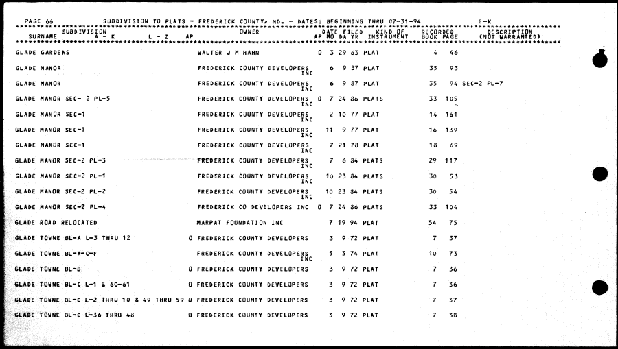 | GLADE GARDENS WALTER J M HAHN 0 3 29 63 PLAT 4 46 GLADE MANOR FREDERICK COUNTY DEVELOPERS 6 9 37 PLAT 35 93 INC GLADE MANOR FREDERICK COUNTY DEVELOPERS 6 9 87 PLAT 35 94 SEC-2 PL-7 INC GLADE MANOR SEC- 2 PL-5 FREDERICK COUNTY DEVELOPERS 0 7 24 86 PLATS 33 105 INC GLADE MANOR SEC-1 FREDERICK COUNTY DEVELOPERS 2 10 77 PLAT 14 161 INC GLADE MANOR SEC-1 FREDERICK COUNTY DEVELOPERS 11 9 77 PLAT 16 139 INC GLADE MANOR SEC-1 FREDERICK COUNTY DEVELOPERS 7 21 73 PLAT 13 69 INC GLADE MANOR SEC-2 PL-3 FREDERICK COUNTY DEVELOPERS 7 6 34 PLATS 29 117 INC GLADE MANOR S6C-2 PL-1 FREDERICK COUNTY DEVELOPERS 10 23 84 PLATS 30 53 INC GLADE MANOR SEC-2 PL-2 FREDERICK COUNTY DEVELOPERS 10 23 84 PLATS 30 54 INC 6LADE MANOR S£C»2 PL-4 FREDERICK CO DEVELOPERS INC 0 7 24 86 PLATS 33 104 f SLABE ROAD RELOCATED MARPAT FOUNDATION INC 7 19 94 PLAT 54 75 SLADE TGfrfNE BL-A L-3 THRU 12 0 FREDERICK COUNTY DEVELOPERS 3 9 72 PLAT 7 37 GLADE TOWNE 8L-A-C-F FREDERICK COUNTY DEVELOPERS 5 3 74 PLAT 10 73 INC 6tAB£ TOtlNE 8L-8 0 FREDERICK COUNTY DEVELOPERS 3 9 72 PLAT 7 36 SLIlOe T0WNE BL-C L-1 I 60-61 0 FREDERICK COUNTY DEVELOPERS 3 9 72 PLAT 7 36 ^«M.0£ fOMNE SL-C t-2 THRU 10 8 49 THRU 59 0 FREDERICK COUNTY DEVELOPERS 3 9 72 PLAT 7 37 |lfl|iil fOWNE SL-C i~36 T«KU 48 0 FREDERICK COUNTY DEVELOPERS 3 9 72 PLAT 7 38 |
