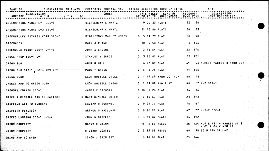 | GREENSPRING ACRES L-1 SEC-1 yiLHELMlNA C MARTI 9 24 35 PLATS 32 20 SREENSPRING ACRES L-2 SEC-1 yiLHELMINA C MART/ 11 13 36 PLATS 34 33 GREENVALLEY ESTATES CQRR SEC-2 MIDDLETOMN VALLEY HOMES 0 5 11 79 PLAT 20 90 GREENiOOD KARN J P INC 10 9 53 PLAT 3 156 GREENMOOO POINT SEC-1 L-1-4 JOHN A GREENE 0 2 16 84 PLAT 28 176 GREGG PROP SEC-1 L-1 STANLEY W GREGG 0 3 26 81 PLAT 23 171 GREGG SUB ANNA H HALL 6 23 89 PLAT 41 53 PUBLIC TAKING 3 FARM LOT GREGG SUB SEC-1 L-2-3 REV L«i pgyL 7 GREGG 0 5 8 75 PLAT 11 106 * GREiG SU80 L£ON fiUSSELL GREGG 0 1 19 89 FARM LOT PLAT 40 18 SREfiGS Af>9 TO GREGG SU80 LEON RUSSELL SREGG 0 1 19 89 ADO PLAT 40 17 L-3 SEC-1 GREGORY CORNER SEC-1 JAMES E GREGORY 0 10 5 76 PLAT 14 36 SRI6R & KIM8ALL ADD TO IARICCI 0 MARY KIMBALL GRIER 0 7 15 82 PLAT 25 192 GRIFFINS ADO TO DURRANI SAJJAO H DURRANI 0 9 21 77 PLAT 16 67 GRIFFITH DIVISION ARTHUR G NAILL-JR C 8 20 91 PLAT 47 77 L-1-2 SEC-1 t SKIFFS LARI&INS SEC-1 L-1-2 JOHN D GRIFF IS 0 3 31 37 PLATS 34 192 aftl«« PROPERTY NANCY R GRIMM 11 5 87 RESUB 36 134 409 & 411 N MARKET ST t 7 21 & 23 W 4TH ST SRIMM PROPERTY R JERRY COATE5 0 2 15 89 RESU8 40 58 23 H 4TH ST L-2 fi«l«S AW TO GRIM SIMON J GRIM EST 6 10 82 PLAT 25 146 |