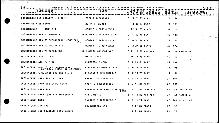 | GRINDSTONE RUN ESTATES L-1 SEC-1 FRED C ALEXANDER 0 3 20 75 PLAT 11 74 6ROMER ESTATES SEC-1 BETTY F GRQMER 8 30 74 PLAT 10 151 GROSSNICKLE JENNIE R JENNIE R GRQSSNICKLE 12 30 35 PLATS 32 103 GRQSSNICKLE ADD TO BURDETTE 0 BURDETTE RICHARD A INC 0 4 20 78 PLAT 17 113 GRQSSNICKLE ADD TO GROSSNICKLE CEMETERY ROBERT T GROSSNICKLE 0 6 30 78 PLAT 18 22 INC GROSSNICKLE ADD TO GROSSNICKLE RCSERT T GROSSNICKLE 0 2 27 86 PLATS 32 176 GROSSNICKLE ADD TO GROSSNICKLE 0 C BASIL GROSSNICKLE 0 11 3 88 ADD PLAT 39 66 PARCEL B GROSSNICKLE ADD TO LEWIS WAYNE LEWIS 10 7 75 PLAT 12 57 * GROSSNICKLE ADD TO MISS FLORETTA M COOK 0 2 26 80 PLAT 21 194 GROSSNICKLE ADO TO THE EVANGELICAL E 9UENTINE GROSSNICKLE 0 6 3 77 PLAT 15 96 LUTHERAN CHURCH OF ST PAULS GROSSNICKLE E OUENTIN SUB SEC-1 L-2 £ QUENTIN GROSSNICKLE 0 7 13 73 PLAT 9 38 GROSSNICKLE FARM SUB L-1 SEC-1 RALPH U GROSSNICKLE 0 5 23 79 PLAT 20 104 GROSSNICKLE FARM SUB L-2-3 SEC-1 RALPH U GROSSNICKLE 0 7 11 80 PLAT 22 130 GROSSNICKLE FARM SUB FARMERS & MECHANICS NATIONAL 7 1 94 CORR PLAT 54 46 L-1 SEC-1 on **^ GROSSNICKLE FARMS INC ADD TO LAFORCE R E LAFORCE 0 11 2 88 ADD PLAT 39 61 PARCEL A GROSSNICKLE HOME MAURICE E GROSSNICKLE 0 10 3 91 PLAT 47 144 SEC-1 L-1 GROSSNICKLE INC ADD GROSSNICKLE INC 4 12 84 PLATS 29 32 GROSSNICKLE INC MOUNTAIN LAND SURVEY 4 12 84 PLATS 29 31 |