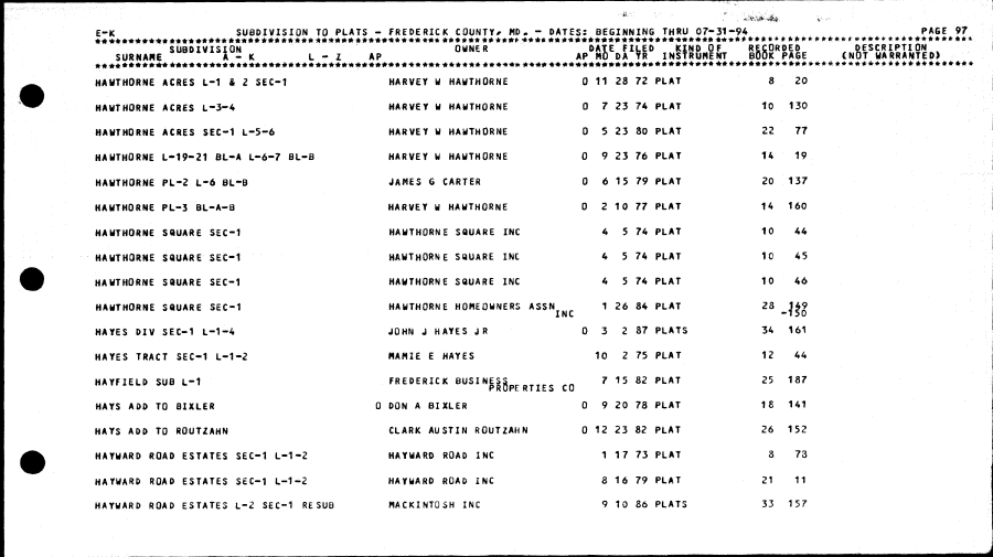 | HAWTHORNE ACRES 1-1 & 2 SEC-1 HARVEY W HAWTHORNE 0 11 28 72 PLAT 8 20 HAWTHORNE ACRES L-3-4 HARVEY U HAWTHORNE 0 7 23 74 PLAT 10 130 HAWTHORNE ACRES SEC-1 L-5-6 HARVEY W HAWTHORNE 0 5 23 80 PLAT 22 11 HAWTHORNE L-19-21 BL-A L-6-7 BL-B HARVEY U HAWTHORNE 0 9 23 76 PLAT 14 19 HAWTHORNE PL-2 L-6 BL-B JAMES C CARTER 0 6 15 79 PLAT 20 137 HAWTHORNE PL-3 BL-A-B HARVEY W HAWTHORNE 0 2 10 77 PLAT 14 160 HAWTHORNE SQUARE SEC-1 HAWTHORNE SQUARE INC 4 5 74 PLAT 10 44 HAWTHORNE SQUARE SEC-1 HAWTHORNE SQUARE INC 4 5 74 PLAT 10 45 HAWTHORNE SQUARE SEC-1 HAWTHORNE SQUARE INC 4 5 74 PLAT 10 46 HAWTHORNE SQUARE SEC-1 HAWTHORNE HOMEOWNERS ASSN 1 26 84 PLAT 23 149 INC -ISO HAYES DIV SEC-1 L-1-4 JOHN J HAYES JR 0 3 2 87 PLATS 34 161 HAYES TRACT SEC-1 L-1-2 MAMIE £ HAYES 10 2 75 PLAT 12 44 HAYFIELO SUB L-1 FREDERICK BUSINESS 7 15 82 PLAT 25 187 P R U PC R T 1 c 5 C U HAYS AOO TO BIXLER 0 DON A BIXLER 0 9 20 78 PLAT 18 141 HAYS ADD TO ROUTZAHN CLARK AUSTIN ROUT2AHN 0 12 23 82 PLAT 26 152 HAYWARO ROAD ESTATES SEC-1 L-1-2 HAYWARO ROAD INC 117 73 PLAT 8 73 HAYWARD ROAD ESTATES SEC-1 L-1-2 HAYWARO ROAD INC 8 16 79 PLAT 21 11 HAYWARD ROAD ESTATES L-2 SEC-1 RE SUB MACKINTOSH INC 9 10 86 PLATS 33 157 |