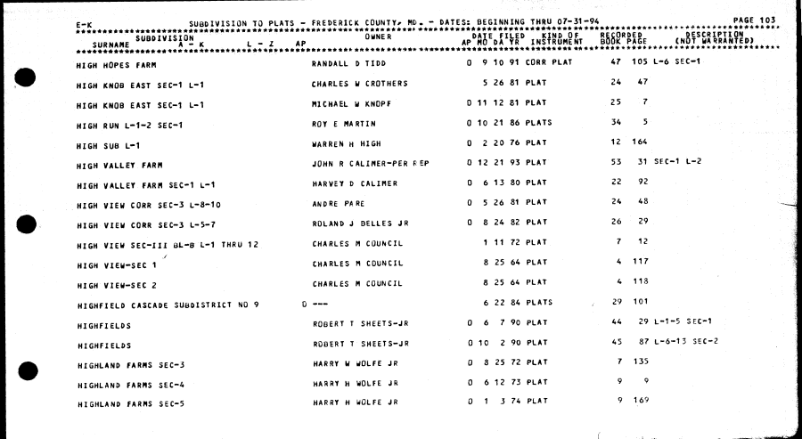 FREDERICK COUNTY CIRCUIT COURT (Plat Book, Index) 1907-1994 MSA C2320-1MSA C2320-1, Image No: 331 Enlarge and print image (63K) |
