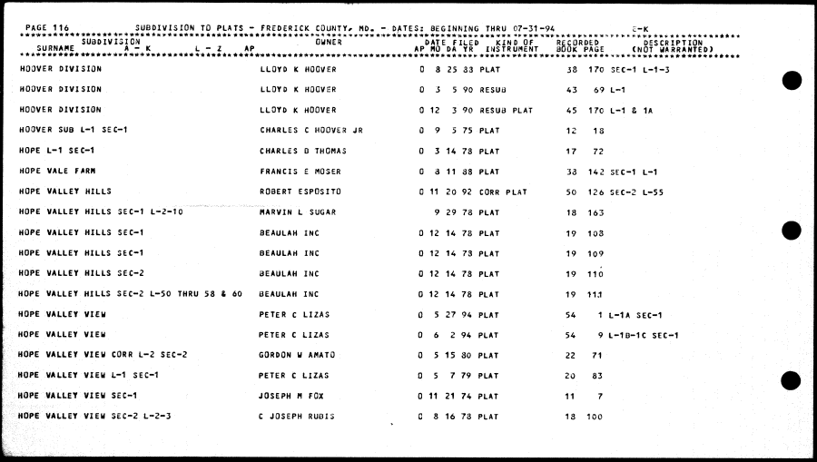 | HOOVER DIVISION LLOYD K HOOVER Q 8 25 83 PLAT 38 170 SEC-1 L-1-3 HOOVER DIVISION LLOYO K HOOVER 0 3 5 90 RESUB 43 69 L-1 HOOVER OIVISION LLOYD K HOOVER 0 12 3 90 RESUB PLAT 45 170 L-1 ft 1A HOOVER SUB L-1 SEC-1 CHARLES C HOOVES JR 0 9 5 75 PLAT 12 18 HOPE L-1 SEC-1 CHARLES B THOMAS 0 3 14 73 PLAT 17 72 HOPE VALE FARM FRANCIS £ MOSER 0 a 11 38 PLAT 33 142 SEC-1 L-1 HOPE VALLEY HILLS ROBERT ESPQSITO 0 11 20 92 CORR PLAT 50 126 SCC-2 L-55 HOPE VALLEY HILLS SEC-1 L-2-10 MARVIN L SUGAR 9 29 73 PLAT 18 163 HOP£ VALLEY HILLS SEC-1 3EAULAH INC 0 12 14 78 PLAT 19 103 HOPE VALLEY HILLS SEC-1 BEAULAH INC 0 12 14 73 PLAT 19 109 HOPE VALLEY HILLS SEC-2 8EAULAH INC 0 12 14 78 PLAT 19 110 HOPE VALLEY HILLS SEC-2 L-50 THRU 58 & 60 8EAULAH INC 0 12 14 78 PLAT 19 11.1 HOPE VALLEY VIEW PETER C LIZAS 0 5 27 94 PLAT 54 1 L-1A SEC-1 HOPE VALLEY VIEW PETER C LIZAS 0 6 2 94 PLAT 54 9 L-1B-1C SEC*1 HOPE VALLEY VIEW CORR L-2 SEC-2 GORDON W AMATO 0 5 15 BO PLAT 22 71 HOPE VALLEY VIEW L-1 SEC-1 PETER C LIZAS 0 5 7 79 PLAT 20 83 HOPE VALLEY VIEW SEC-1 JOSEPH « FOX 0 11 21 74 PLAT 11 7 HOP!VALLEY VIEW SEC-2 L-2-3 C JOSEPH RUBIS C 8 16 78 PLAT 18 100 * |