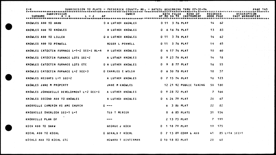| KNQWLES ADD TO HAHN 0 A LUTHER KNOWLES 0 11 3 76 PLAT 14 62 KNOWLES ADD TO KNOWLES A LUTHER KNOULES 0 6 16 76 PLAT 13 33 KNQWLES ADD TO LILLER 0 A LUTHER KNOWLES 0 11 3 76 PLAT 14 62 KNOULES ADD TO PENWELL ROGER L PENWELL 0 11 3 76 PLAT 14 65 KNOWLES CATQCTIN FURNACE L-1-2 SEC-I BL-A A LUTHER KNQWLES 0 4 17 74 PLAT 10 60 KNOWLES CATOCTIN FURNACE LOTS SEC-2 A LUTHER KNOWLES 0 9 23 76 PLAT 14 18 KNOWLES CATOCTIN FURNACE LOTS ETC 0 A LUTHER KNOWLES 0 9 8 77 PLAT 16 55 KNOWLES CATOCTIN FURNACE L-2 SEC-3 0 CHARLES E WELSH 0 6 30 78 PLAT 18 37 KNOWLES HEIGHTS L-1 SEC-2 A LUTHER KNOWLES 0 7 15 74 PLAT 10 123 KNOWLES JANE « PROPERTY JANE M KNOWLES 12 21 92 PUBLIC TAKING 50 180 KNOWLES JOHNSVILLE DEVELOPMENT L-2 SEC-I A LUTHER KNOWLES 0 9 28 72 PLAT 7 164 KNOWLES SECOND ADD TO KNOWLES A LUTHER KNOWLES 0 4 24 79 PLAT 20 67 KNOXVILLE CAMERON VS AHE CHURCH 0 —— 6 3 80 PLAT 22 82 KNOXVILLE OVERLOOK SEC-1 L-1 TED T MERCER 8 6 85 PLATS 31 154 KNOXVILLE PLAN OF —— 2 13 73 PLAT 7 199 KOCH ADD TO SHAW GEORGE J KOCH 0 1 18 79 PLAT 19 175 KOEHL ADD TO KOEHL 0 GERALD F KOEHL 0 7 13 89 CORR & ADD 41 85 L-1A SEC-1 KOEHLS ADD TO KOEHL ETC HOWARD T DINTERMAN 0 10 18 83 PLAT 23 48 |