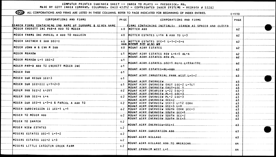 | _J £ARCH FIRMS CONTAINING 1NP NAME BY, SURNAME & GIVEN-NAME_____ MOSER EVERETT INC PAR-A ADD TO NOSER 60 MOSER FARMS INC PARCEL A ADD TO HALLEIN 60 MOSER GAITHER E SUB SEC-I 60 __ ____________________________________________________£#* MOSER JOHN U I EVA M SUB 60 MOSER MEADOW 61 MOSER MEADOW L-1 SEC-2 61 MOSER PAR-B ADD TO EVERETT MOSER INC 61 MOSER SUB 61 MOSER SUB RESU8 SEC-3 61 MOsH* SUB SEC-III L-1-2-3 61 MOSER SUB SEC-2 L-201 ~ 62 MOSER SUB SEC-4 L-4 62 MOSER SUB SEC-4 1-5-6 & PARCEL A ADD TO 62 MOSER SUBDIVISION II SEC-1 L-1 62 MOSER TO MOSER ADD 62 MOSER TO SHAFER 62 MOSER VIEW ESTATES I 62 i ______ _____________________________ ______ _ ______ ______ _____ __ _ _ __ i MOSERS ESTATES SEC-1 L-1-2 i 62 i ____ _._„„,..„.,.,.„ ....„.,_.„„„..,__._„__..._____.„.____^__________.._____..._......__.__..._____________._.__.__,_____„____.„_.._._..„„.__„—_„._.i.._.._.....„.__..__.,,._ HOSERS ESTATES SEC-2 L-3 | o2 MOSERS LITTLE CATOCTIN CREEK FARM j 62 iIRHS CONTAINING INITIALS; SEARCH AS SPACED AND CLOSED ___._ HOTTER ADD 62 HOTTER ESTATES L-1A & ADD TO L-3 62 MOTTER ESTATES SEC-1 L-1-2-3-4 62 ; MOTTNf *m AT.Sn M*______________________________________. ——— MOUNT AIRY ESTATES 62 MOUNT AIRY ESTATES REV L-4-5 BL-A 62 -aOUlH-JURT ESTATES REV PL___________________- .__.._._ ._.._42_ _ MQUNT AIRY ESTATES SEC-1 BL-£ L-19A-19C_________ _ -42 MOUNT AIRY E STATE S-BL-ASB_____________________._....._...__ 62 _ MOUNI-AXR-Y—INDUSTRIAL PARK WEST L-1^2___________ ._....._....... _._6i _ I -MOUNT JURY OVERVIEW_____________________________._.....„]..—61-MOUNT AIRY OVERVIEW EAST SEC-2 L~1d ] 63 -. MUlOL^AIRY-nVERVIFW-FAST-SEC-J__________.______ 61-MOUNT AIRY OVERVIEW L-22 SEC-3 63 MOUNT AIRY OVERVIEW PL-1 SEC-3_________________ 63 MOUNT AIRY OVERVIEW PL-2 SEC-3 63 _ MflJWHT AI RY OVE RVI E W SEC-2___________——____—_..._.... 63 MOUNT AIRY OVERVIEW SEC-3 L-12 CORK 63 ^amAMI-^AIRY— aVJL&V-IEW SFC-^3-a^g__________ ____-_..— . 63 MOUNT AIRY OVERVIEW SOUTH CORR SEC-3 63 MOUNT AIRY OVERVIEW SOUTH SEC-1_______________._....... 43.. MOUNT AIRY OVERVIEW SOUTH SEC-2 63 M0UHJ—AI RY-_a¥£&MJ-£M_.SOUIiL-S£LC^3_______.____.._.___..........._._..... 63 ._ BOimT—AXAy_-J3J/E RVI E W-S£C=J_________________..__._.__.... 63 BOUft-f-JU-RX-S UB S T A TJ4XN-JUXO________________ 43 MOUNT AIRY VILLAGE_______________________-_...._................ ... ............. ...... 63-. - _ ttOUAUL. AX&JL.-V Tl. L A G E -. Afta_I'-Q—AKLR1CW_____.....____........... 64 _ttOUH3LX£iifiA-XH Ji£SJ_^L^-J______________._„_._.„_............ .............................6A.. ... i |