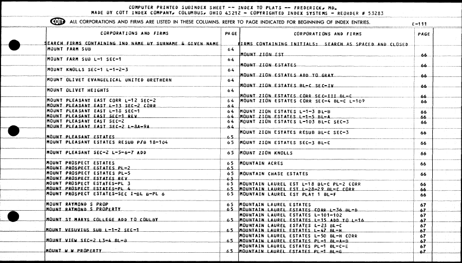 | _-T£AfijCJi^f JJUBS. JUIM^ MOUNT FARM SUB 64 MOUNT FARM SU8 L-1 SEC-1 64 MOUNT KNOLLS SEC-1 L-1-2-3 64 MOUNT OLIVET EVANGELICAL UNITED 8RETHERN 64 MOUNT OLIVET HEIGHTS 64 MOUNT PLEASANT EAST CORK L-12 SEC-2 64 ^mmi^^.UL$Al&-£j^-J^}3^SLL-^JLa&R_________________ __AA.- MOUNT PLEASANT EAST L-1S SEC-1 64 _ MOUNT PLEASANT £AST $£C-1 8EV___________________-_____6A~ MOUNT PLEASANT EAST SEC-2 64 _ HQ.UMT-. PJt.gA.SANT £A§T S£C-2 L-8A-94________________________6A- _ HO U N T -EL£ASAHX-^£SXAH£S———..___________________________6J5L_ MOUNT PLEASANT ESTATES RESUB P/B 18-104 65 MOUNT PLEASANT SEC-2 L-5-6-7 ADD 65 MOUNT PROSPECT ESTATES 65 __ MOUNT JPROSPECT-ESTATES PL-2____________________________6Jx_ MOUNT PROSPECT ESTATES PL-5 65 _ MOUNT PROSPECT- ESTATES -R£V__________________________- 65- MOUNT PROSPECT ESTATES-PL 3 65 _ MOUNJL PROSPECT-EAT AT ESrPJ.—4___________________________65_ MOUNT PROSPECT ESTATES-SEC I-BL B-PL 6 65 MOUNT RAYMOND 3 PROP 65 _ MQUNT RAYMOND S PROPERTY_________________________________6_5_ _ MOUNT ST MARYS COLLEGE ADD TO CQULflY_______________________65 _ MQUNT VESUVIUS SUB L-1-2 SgC-1____________________________65 __ MOUNT VIEM SEC-2 L 3-4 81.-3____________________________6-5— _ MOUNT y y PROPERTY____________________________________6_5__ J IJuaS-CflMIAXJJlNjG-lM IT I At. S :_ S f. ARCK-AS-AEA££J>-JU>UL-tU)SEO.- . MOUNT. ZIOfcLXSI________________________________.—_-.—... —66- I MOUNT IION ESTATES___________________-__ I &6 MOUNT ZION ESTATF.S AOP TO GRAY______________._.. .—._.._.._...-.L.....66— _ Mf)nMT 7IQM P STATES «l-C SEC-IV___________...___-_...-.. - _ _..—.[..... 4& -MXUlNJL ZION -EJ5JAX£S-COR,R-SEC-.III Bl-f_________-___ _....-.-..{...-..66--. MOUNT 2ION ESTATES CORR SEC-4 8L-C L-109 j 66 _________________|_____________r^^T_____________________|_____________________________ _ _ „ „ I MOUNT 2ION ESTATES L-1-3 BL-B ! 66 MOUNT II0>i ESTATES L-1-5 BL-A________.___._____ | 6.6-- MOUNT 2ION ESTATES L-103 BL-C SEC-3 66 MOUNT 2ION ESTATES RESUB BL-C SEC-3 66 MOUNT ZION ESTATES SEC-3 BL-C 66 MOUNT ZION KNOLLS 66 MOUNTAIN ACRES 66 MOUNTAIN CHASE ESTATES 66 MOUNTAIN LAUREL EST L-18 BL-C PL-2 CORR 66 MQUNTAIM JAiigFI. E$T l-gfl-PQ ft|_-C CP»»_____________ __~—J__66— MOUNTAIN LAUREL EST PLAT 1 8L-F 66 MOUNTAIN LAUREL ESTATES 67 .MOUNTAIN LAURFL ESTATFS CORR L-^6 BL"Ua__________________62— MOUNTAIN LAUREL ESTATES L-101-102 67 . MOUNTAIN IAUREL ESTATES t~1S AQD TO 4-16_________._____ —..-6Z_ MOUNTAIN LAUREL ESTATES L-23 BL-C 67 .MOUNTAIN LAUREL E$TAT£$ L-47 8J-H_______________________-_AZ_ MOUNTAIN LAUREL ESTATES L-50 BL-H CORR 67 . MOUNT AIM LAUREt ESTATES PL-1 flt..-A-H___________________. ^-^67— MOUNTAIN LAUREL ESTATES PL-1 BL-C-E 67 .MOUNTAIN I.AUREi IfSTATFS PL-1 BL-S______________________6Z_ |