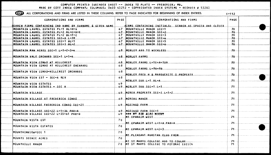 FREDERICK COUNTY CIRCUIT COURT (Plat Book, Index) 1907-1994 MSA C2320-1MSA C2320-1, Image No: 398 Enlarge and print image (130K) |