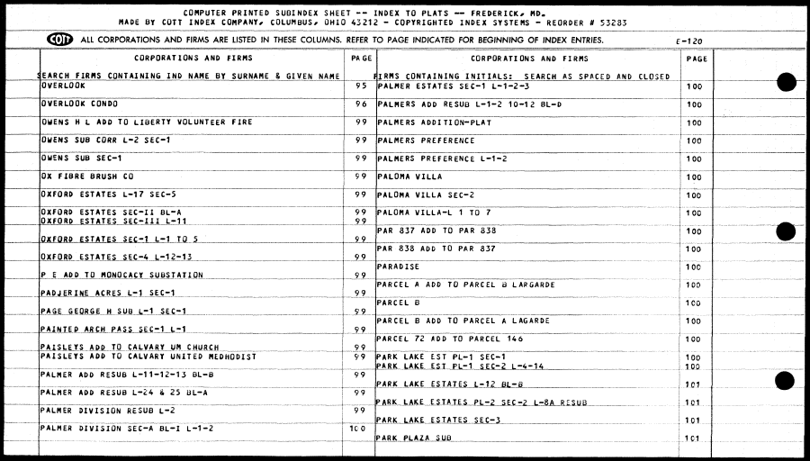 | SEARCH FIRMS CONTAINING IND NAME BY SURNAME & GIVEN NAME _____ ~OVERLOOK 95 _ Q^ERLOgj^-p^Q py- OtfEfTsTli^^^^TTiBiiRW^oTu NT E^ i^TIi^ 99" "oy¥Ns SUB coRRT^~sT<>i99" " b"SESTTiSB~^Ec-i 99"" " OX FI8Ri~BRUS»TTo "~ 9~9~ OXFORD~ESTAfis~L^T7TEC^5 ~" 9T~ OX?ORO~ESIrA?es~iic-Ti "el"- A 99" OXFORD ESTATES SEC-III L-II_______________J95L_ .Qita&£__£$lAl££-£EtelJ^L-lSL.l._____________________L_il_ OXFORiL_ESTAtES SEC-4 L-11-11.__ _ _ ___ 99 _ ___ _ _ __ __ __ . ^.^. _fL...l^M^Iil.^JM£AlI^iM.lSXAT.lOM^___.__________________9_9_ PAJJLEAlliE_At?lS. t-J_ SEC-.1 ^ _ ___ ___ __ __ 1. _?? __!_ . . PAM.^MflSJiI.,^it-Ayii-d_.^£C-l^..__.__________________...__i__9_9_. .£AlMIiAJL^JLJ^lS_J^i=J_L-1.._....__________________1_9_9_ PMSLOS A§£ TO CALVA8JL UM CHyRCH __ ^ _ ^ _J99 PAISLEYS ADD TO CALVARY UNITED HEDHODIsf 99 .___.... ...._..__._ _ ^_ i PALMER ADO RESUB L-lt-12-13 BL-8 I 99 "pAT"«R~^D~TE^u1TL^4^"y5"¥L-A~~ ——————___ _..___.^ ___ i _ i p^rMl^'oTvTsl^Tfsue'T-2 " "" ~"~~ ~ ""'"" '""" ~""~ "t"~9?" PALMER bl"\/l'sION""Til^"A~"BlL-l" L-1-2 " ~ " Too ~ IRHS CONTAINING INITIALS: SEARCH AS SPACED AMD CL03E&______ PALMER ESTATES SEC-1 L-1-2-3 100 p7LHiRi~ADO~¥£SUB L-1-2 10-12 BL-D 100 PAL Mi¥s^l^TTTON::?rAT 100 PALMERS PREFERENCE 100 PALMERS PREFERENCE L-1-2 100 _____________________________________________________________________.__._„...!__._____ PALOMA VILLA | 100 PALOMA VILLA SEC-2 j 100 p7iL^iiA^nrA^T~T~To~T ~" ~~"~"—•---• ~"~~m^~~ PA^ 837 ADD TO PAR 833100 PAR 838 ADD TO PAR 837 100 _______ , .... . .^......__..- ! p7lRC"^O^TDT"T6~l':Al^r^T^Rl_AWE ] 1 OD I PARCUTT"" " 100 P^R^cTL ¥ AD^D WTARCIT^A I AoTRDE 1 00 PARCEL""72:~7F"D TO P/TRC£T^U6 100 FA^lTTAlcE~TsinpT^TTiE^i "" ""-""-• • "~"' •""" too'' PARK LAKE EST PL-1 SEC-2 L-4-U______.________..._............_..._ ..1.Q& . ..... PAM.JJM^£__gSIAIJsJL-L=JZJS]^L&___________________........... . .. .......... 1..01... PABK^ijyLL^EAmjA^^ ___ .1.0.1 P_AJjK_JjLlL£_££IAI£SL-i££rJ_____________._.___......._._.._... .... ... 1.01.......... P_ARJL_ekA£&_Jii-fi__________________._.„_.____....__._.__.._.. .... . ..... ........1 0.1.... |