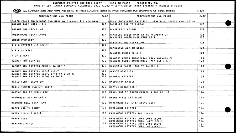 | i EARCH FIRMS CONTAINING IND NAME BY SURNAME & GIVEN NAME_____ SUINNS FARM LOTS L-1-2 121 —J|||(S SUB~SEC.j Y-^IizT ^JYJ^MS uoolTTEl^Tl^-s121 _.._..__._-.._________^JY ^^^"^^YT^^T^Ec^-ir Tz 2 i"a~FT ST/Tris ~~"~ izT _^r__^_____._ _ ~~"~i_T2 '^^fff~^^f_Y^f^ ~lzT -y^jT RoiTlEStATeyTORR~iL'^T6~^lEC^2 122! RJjfiilTnRTj»riTrATirTiF^L^2-7 rzT __ RA5fill-gUM-£5IAI£l--Sl£.-2 L^LJ^lZ_i_Zfi^23_____________1Z1. RABBIT RUN ESTATES SEC-2 L-13-19 122 "^Yo^co^f^jg^-i'"^^" —--"- • — "~i2y ^'ioa^7d"iJE¥^ytrB^i^"sTc-~i " ~12T _ _^______ __.._____ „_ _ _ _ ._. . __„_ RAHOCMiKS~AO"D T6 CRoss "izT FA IN BOiTHILL S E C-F~L-T~~"""" " ~ " -———--•———- j^y RAMEY A0^> TCT RAMEY ~~~-j^2" R AWE y~ SnL^~SEC-"l ~ ~~~~~"" ~ ~~" ——--•— ————-————•-. RAMET SUBO it 3 RAMS8URG ACRES l"2 3 IIRMS CONTAINING INITIALS: SEARCH AS SPACES A»iD CLOSI fi_ _____ RAHSBURG ADO TO DUNCAN 123 RAMSBURG DIVISION 123 RAfliiITRG^JAlcOB~R^jT ET AL PROPERTrTF^ 123 _ RAMSBURG JACOB R-JR PROP ET AL_____________________ ____1 Zl_ RAMSBURG SUB SfC-2 L-1______________________________.____12i_ RAHSBURGS ADD TO QLSEM____________________________..„_.___U3- RANGERS HQGOS BL-A-B_____________________________,__.........t?Ll_ RANGERS MOODS INDUSTRIAL PARK AMENDED PL 123 RANGERS yOODS INDUSTRIAL PARK SEC-I L-1 123 RANSOM S MARVEL ADD TO RANSOM S 123 RANSOM DIVISION 123 RAPHAEL ESTATEST [ 123 RASP^ERRY^KNbTLS 123 _ _..._.....-____-..___..-._____ - - _ ___ -._. .....................^ .^ ^ . RAUCH AD^D TO RAUCH PARCEL A ADD TO L-1 124 RAUHS ACRE~S~L-1 SEC-1 124 RAVYfjW^OOD EsFT^67~sTc^ToR"R 1 24 RAVENyQOD ESTATE^ 124 RAVENWOOD ESTATES ADD SEC-II 124 RAVENWOOD ESTATES CORR L-f2~SE"c-3~ 124 RAM£llMQ01L-iSLlJ^t£]L_illjaS^ 12A RAVENyOOD ESTATES CORR L-13 SEC-3 | 124 ^ 8AJtJUiMQQiLJEiljUiS_CflM_i=i_Sli=.^^ ..............I-.-12A- |