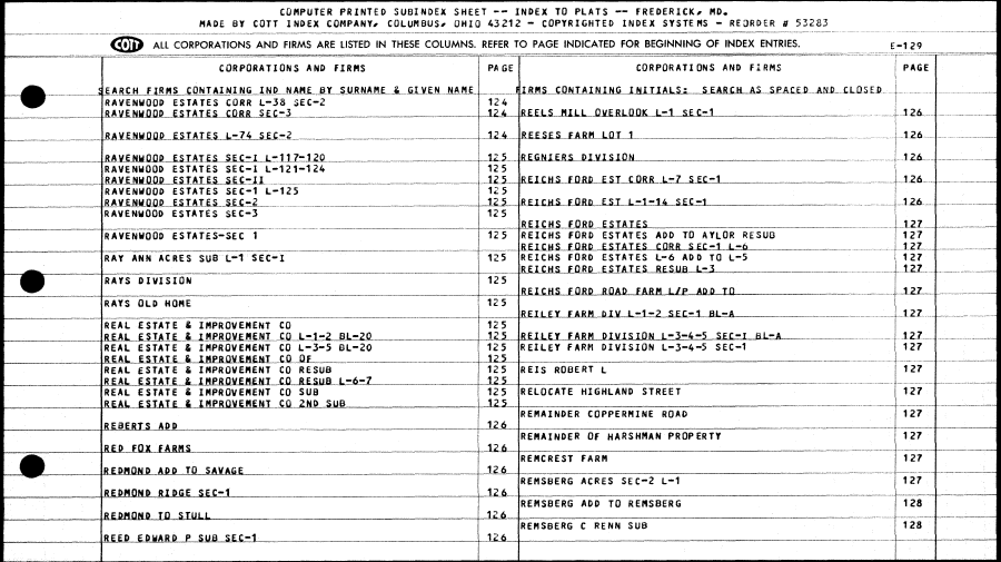 | __JMBiJLJlRMS^Q^ ____ RAVENyQQD ESTATES CORR L-38 3EC-2 124 ___ &AJ£fJJMiMfi_£-S1AI14._caA&_££&?3________________________12A^ __JMY£llMJmfi_liIAMi_J^I4_i£C=2___________..________._12A- __!A3t£lIMimft_^Sl/U^5_SiJC=i_J^dJJ=12ft.___________________1Z1_ RAVENUOOD ESTATES SEC-l L-121-124 125 __MltIJ!MimiL_£SlAIJS_l£f=lI_.__.___________________.__._U5_ RAVENtfOQD ESTATES SEC-1 L-125 125 .__ RAYimaQD £SjrA_T£$__SijC-^ ._.__„.__ __________ ________12J_ RAVENWOQD ESTATES SEC-3 125 _ .„________ __ j^j£—-^—————— ^j_- - ----^^-^-^^-^^^^-^^--^ - — ^—£-_ ...._..-_.____.___.______ "~t25~ RT^QTsTHQME~~ 12T" RTAr^lTFAl'T^^Tii^ViiNl^^co izT" __ REAL ESTATE & IMPROVEMENT jCH t-1-2 BL-20______________ J_2J_ REAL ESTATE & IMPROVEMENT CO L-3-5 BL-20 125 ___ REAL ESTATE & IMPRQVEMEMT CO OF_________________________125- REAL ESTATE & IMPROVEMENT CO RESUB 125 ___ REAL ESTATE & IMPROVEMENT CO RESUB L-6-7_______________125 REAL ESTATE & IMPROVEMENT CO SUB 125 ___ REAL ESTATE & IMPROVEMENT CQ 2ND SUB____________________Ui_ __ &iajEJX5_AM________________________________________12_6_ __ fijEjL,__£aiLJEAAflS____________________________________lZj&_ __ REOHOND ADO TO SAVAGE________________________________12 6__ __ RgPHON& Rloai_S_££rJ_______________________________1ZA_ ___ REDMQNO TO STULL________________________________________l£ji_ __ REED EDWARD P SUB SEC-1_______________________________12L6_ J JjBII&-jCJtfU^IilIliiLJJUIlM^_-JLEAR C H AjSL_&EA££A_AflLfl-CLQS£J)- -.[.-....-_. __ REELS MILL OVERLOOK L-1 SEC-1___________________ __.J2d _R££JS£5L_£A1ULJJQ1_1___________________________ .126 i _ RJ&fiJilffiJLJJlJLLSJLGN___________________________._._...._._.....|-...12ji i REICHS FORD EST CORR L-7 SEC-1__________________._.____...J^6. _ RJEXiLM^_£llflJL_.OI^i^lrl^_S£Lr1_________________ ____...|. J 26 ( REICHS FORD ESTATES___________________________.__.___...._L2Z REICHS FORD ESTATES ADO TO AYLOR RESUO 127 _ REICHS FORD ESTATES CQRR SEC-1 L-6_________ .. . \ 12Z REICHS FORO ESTATES L-6 ADO TO L-5 | 127 REICHS FORD ESTATES RESUB L-3______________„_ ,_..12Z _ REICHS FORD ROAD FARM L/P ADO TQ__________._____...__UZ REILEY FARM DIV L-1-2 SEC-1 BL-A_____________.___._122- REILEY FARM DIVISION L-3-4-5 SgC-I BL-A ______„... _ 121 REILEY FARM DIVISION L-3-4-5 SEC-1 127 REIS ROBERT L 127 RELOCATE HIGHLAND STREET 127 REMAIND¥R C¥PPERMINE ROA^127 REMAINDER OF HARSHMAN PROPERTY 127 REMCREST F^RM 127 RlEMiiiERG^TrCRES s¥c-2 L-1 —-— ^~- RE«si¥RG~ATD TO^RFMSBE^G 128 REMSBERG C RENN SUB 128 |