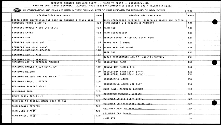 | __j EARCH FIRMS CONTAINING IND NAME BY SURNAME & GIVEN NAME ____ REMS8ERG FRANK G ADD TO 128 ?EM?ai¥G^lR^O~Arsu¥ L-1 SEC-J 128 R E N$ltell¥T-T4212lT -RgHS——R6 sj^ ^T^~ REMS8ER6 SUB SEC-i L-1 128 RlfMWEluf SUB SEC^I^^y^ 128 ___ RfcHS.BER6.SUB SEC-1 L-2A-28________________________12A_ __ RlMJALftfi_-AJWLJLaJ51iS______________________________UL8_ __ REHSBURG ADO TO REMSBURG____________________ ____12J_ REMSBURG ADD TO REMSBURG AMENDED 123 — j^HHjuTO A^^t2~9~ Fi^aUR6""HiTGHTS " " "~T2~9~ RE MS BUR 6^ HEIGHTS L-2 ADD TO L-1 T2 9 _._..._._._....____...__.._..._______ - _ .. _____ REMSBURGS RETREAT SEC-1 129 REMS8URGS SU8D 129 RENES PLATN SEC-1 L-1 "~"~"~T2 9 ~ REHMTacTTO CAR ROLL MANOR FIRE CO~INC PlzT" REfiN BRANCH ESTATES ! 129 RENN JOHN H-PROP | 129 l ™ „ ! RENN >'A'«"AT~TR"ACT ——-—•- - - -— - — pjT^ JIRHS CONTAINING INITIALS: SEARCH AS SPACED ftHD CLOSED_____ RENN ROBERT U g DARLENE H PROPERTY 129 RENN SUB 129 RENN SUBDIVISION 129 RENNER SAMUEL M SUB L-3 SEC-1 CORR 129 RENNS ADD TO EkfING 129 RENNS NEST L-1 SEC-1 129 REPP SUB 130 RESCO INVESTMENTS ADD TO L-32-33 LOflGVIEW 130 R?sd LUTIONTfARH " ——-.———_-_ . _____________________________________________ ....__. 4. RESOLUTION FARM L-5-8 I 130 _____ _______ _______ __________________ RESOLUTION FARM SEC-1 L-1-4 130 _ RESOLUTION FARM SEC-1 L-9-11___________________.._. J 3Q _ S£50UR£iFUL_AC££5____________________________._....................... 13.Q . RESOURCEFUL ACRES ADD PLAT____________________.__..... ...130. _ BML .HAV.1 N_J|EjBflEJLAJ^. 6A R p EH^____________________... 130 _.R_E£1HAV£JL K£flQLRIAL_JLAR_CiJi5_________________.__......... 130 _R£SJlRM£l_Jltt_a_E__Sl£=lJL^l=2_________________— 130 _ROiMJf£J[^QiL-J^iANJi£AflL£._BLA_CK ACRE ____________.. 13D RESURVEY PART OF MERRYLAND___________________.___................_._.._131L. _BJmiQULL_QR&_£re&Q{>____________________._ ._.__._...... ...............1^0.. -RMQJELJ&Ifi_____________________________._.._.._................................_..._1J1CL. |
