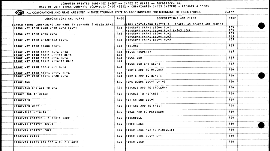 | _J EARCH FIRMS CONTAINING IMP NAME BY SURNAME & GIVEN NAME _____ RID6E WAY FARM CORK L-10 BL~A SEC-1 133 _ ^Y^QY"-^p^RM L-1^ BL_.^ -J33 ~" Rl?^"~₯AYTAlR'M~T::::32^l2i^T-^ 133 RioGrii^y~miiir RTsuT sec^3TsT ~~ n^sin^iY~Ti*iiriE?T^i^^'1^T8 "TsT _ HI PG^JiAJlJLAJIL-^J^^lJL^lrJi^aLrA____________________1JJ_ RIDGE WAY FARM SEC-1 L-1A 8L-A 133 RIOGE WAY FARM SEC-1 L-16^17 BL-A_____________________1_3_i __ RlJB££^M^JLM!L^IJLr^L^£L^&^______________________li_l_ _ &Uii_MI.X-JFABJLJSi£-=3__L=l=l_fiL__A._____________._..___L lil. RIDGE WAY FARM SEC-3 L-28 8L-A 133 ~ FINLAND ~ ~ 134" "^ S^^CAW"lL^I^Al>F''TFl.^6 134~ Rjj^^/j^|TTO~Rl 06 £ " ~~~~T34~ ~ RTcTcEVlElii ~~~" ~~ " ~ " ~~1?4~ RIOG₯VIEW wYsi ~ ~ ~ "" " ~~~ ""TiV i ,... .,._,_,.._._ _ ________.__._..________.__._.._. ,,...._.. _....._.__________^_ __ _ _ _ __ ___ i _ _ RIOGEVILLE HEIGHTS -- "TsV" R i o₯E"i"A~t'^T^ s^^~seT-1~ c OR R ~ ~~ - ^4" ..___...___________......___...._..__.._._ ._ _____.___i__ RIOGEWAY ESTATES SEC-1 | 134 I RlOGEwAY E'''STATES-CORR"~~ ""~"~~ "~"~"~~~ -|-^- ___._________ ________. _ _ _____ _ ._ ______ ____!.___ RIOGEWAY FARMS - -^-^ R 10G £W A Y" rAlRlir^^yElc^' PL-TT--'4^TlR ~~" \~W5~ i . __..__..........._.....__._._._. __.... ..._...__._...._.._ ._. ... ... . . -. i_. IRMS CONTAINING INITIALS: SEARCH AS SP A_CEO_ A NO. CLOSED RIDGEWAY FARMS SEC-4 PL-1 135 RIDGEWAY FARMS SEC-4 PL-1 L-203 CQRR ___ _____ _ ..._125 RIOGEWAY FARMS SEC-4 PL-2 135 RIDGEWAY FARMS SEC-4 PL-3____________________.____._.__._._lJi. RIDGEWAY FARMS SEC-4 PL-5 135 RIDINGS 135 RIGGS PROPERTY135 ___________________________________________ J._____ RIGGS SUB 135 RIGGS SUB L-1 SEC-2 135 RINOTT AOO~TO" BRUCHEY 136 RINDTS ADD TO RINOTS 136 RIPS WOODS SEC«T~L^1-21 136 RITCHIE ADD TO STOCKMAN^ ! 136 RYrTHTFTo iTTCHIE ~ '"""" '"i"36~ ________________________^_____...._.............. i...._ RITTER SUB SEC-1 136 FITTERsnfoo TO CRIST ~~ | 136 i _ __._____._.____._______.__.____..._,_,_____H_..._.._._.»..___.__...._..... ......._,..___._..._.] .......... .._. RIVAS ADD TO PETERSON [ 136 _________ _.__._____________________ ________.._.._...._... ........ .i.......... RIVENDELL | 136 | RIVER OAKS } 136 FIVER OAKS^ADD fbTn«icri7F -- - - --j^- RIVER SIDE SEC-1 L-1136 ___ ____ ______ ____.__________ ________ _ __________ __________ _ __ _ I _ FlVER~VIEii "" ~ " "~ " " ------------------j----..-- _______________________.. ...__.................._....__. I __._...... |