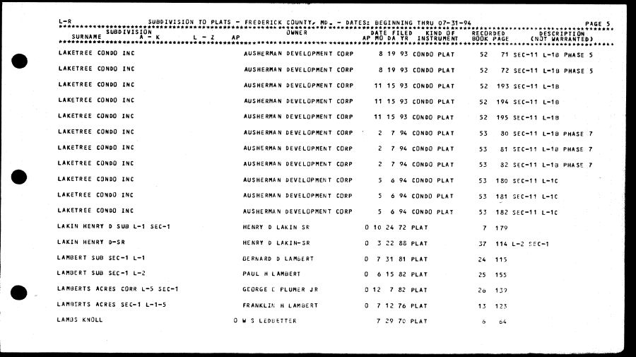 | LAKETRiE CONDO INC AUSHERMAN DEVELOPMENT CORP 8 19 93 CONOO PLAT 52 71 SEC-11 L-18 PHASE 5 LAKETREE CONDO INC AUSHERMAN DEVELOPMENT CORP 8 19 93 CONOO PLAT 52 72 SEC-11 L-18 PHASE 5 LAKETREE CONDO INC AUSHERMAN DEVELOPMENT CORP 11 15 93 CONDO PLAT 52 193 SEC-11 L-18 LAKETREE CONDO INC AUSHERMAN DEVELOPMENT CORP 11 15 93 CONDO PLAT 52 194 SEC-11 L-18 LAKETREE CONDO INC AUSHERMAN DEVELOPMENT CORP 11 15 93 CONOO PLAT 52 195 SEC-11 L-18 LAKETREE CONDO INC AUSHERMAN DEVELOPMENT CORP 2 7 94 CONOO PLAT 53 30 SEC-11 L-18 PHASE 7 LAKETREE CONOO INC AUSHERMAN DEVELOPMENT CORP 2 7 94 CONDO PLAT 53 81 SEC-11 L-18 PHASE 7 LAKETREE CONDO INC AUSHERMAN DEVELOPMENT CORP 2 7 94 CONDO PLAT 53 32 SEC-11 L-18 PHASE 7 LAKETREE CONDO INC AUSHERMAN DEVELOPMENT CORP 5 6 94 CONDO PLAT 53 180 SfC-11 L-1C LAKETREE CONDO INC AUSHERMAN DEVELOPMENT CORP 5 6 94 CONDO PLAT 53 181 SEC-11 L-1C LAKETREE CONDO INC AUSHERMAN DEVELOPMENT CORP 5 6 94 CONDO PLAT 53 182 SEC-11 L-1C LAKIN HENRY D SU8 L-1 SEC-1 HENRY D LAKIN SR 0 10 24 72 PLAT 7 179 LAKIN HENRY D-SR HENRY D LA.KIN-SR 0 3 22 88 PLAT 37 114 L-2 SEC-1 LAMBERT SU8 SEC-1 L-1 BERNARD 0 LAM&ERT 0 7 31 81 PLAT 24 115 LAMBERT SUB SEC-1 L-2 PAUL H LAMBERT 0 6 15 82 PLAT 25 155 LAMBERTS ACRES CORR L-5 SEC-1 GEORGE E PLUMER JR 0127 82 PLAT 26 13? LAMBERTS ACRES SEC-1 L-1-5 FRANKLIN H LAMBERT 0 7 12 76 PLAT 13 123 LAMBS KNOLL 0 W 3 LtDBETTER 7 29 70 PLAT 6 64 |