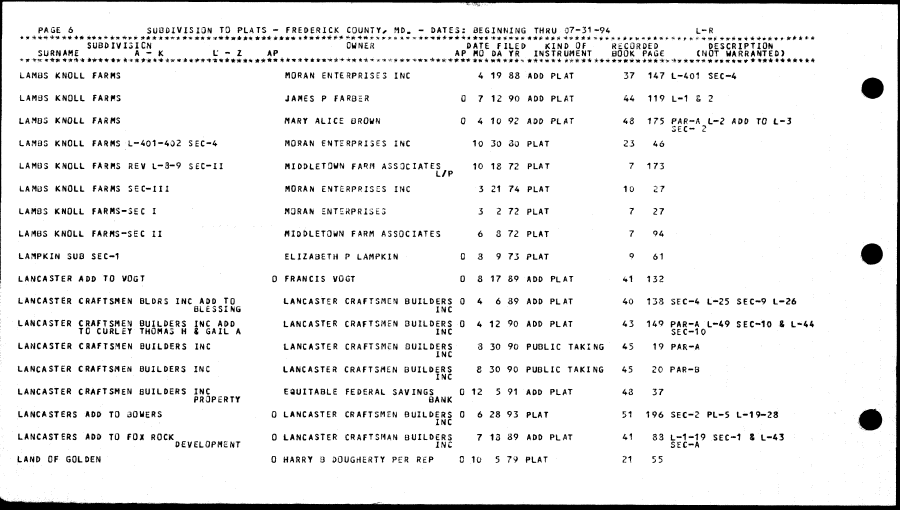 | LAMBS KNOLL FARMS MORAN ENTERPRISES INC 4 19 88 ADD PLAT 37 147 L-401 SEC-4 LAMBS KNOLL FARWS JAMES P FAR3ER 0 7 12 90 ADO PLAT 44 119 L-1 S 2 LAMBS KNOLL FARMS MARY ALICE 8ROWN 0 4 10 92 ADD PLAT 48 175 PAR-A L-2 ADO TO L-3 sec- 2 LAMBS KNOLL FARMS L-401-402 SEC-4 MQRAN ENTERPRISES INC 10 30 30 PLAT 23 46 LAMOS KNOLL FARMS REV L-3-9 SEC-II MIDDLETQWN FARM ASSOCIATES 10 1S 72 PLAT 7 173 L/P LAMBS KNOLL FARMS SEC-III MORAN ENTERPRISES INC 3 21 74 PLAT 10 27 LAMBS KNOLL FARMS-SEC I MORAN ENTERPRISES 3 2 72 PLAT 7 27 LAMBS KNOLL FARMS-SEC II MIDDLETOWN FARM ASSOCIATES 6 S 72 PLAT 7 94 LAHPKIN SU8 SEC-1 ELIZABETH P LAMPKIN 0 3 9 73 PLAT 9 61 LANCASTER ADO TO VOGT 0 FRANCIS VOGT 0 8 17 89 ADD PLAT 41 132 LANCASTER CRAFTSMEN BLDRS INC ADO TQ LANCASTER CRAFTSMEN BUILDERS 0 4 6 89 ADD PLAT 40 138 SEC-4 L-25 SEC-9 L-26 BLESSING INC LANCASTER CRAFTSMEN BUILDERS INC ADD LANCASTER CRAFTSMEN BUILDERS 0 4 12 90 ADD PLAT 43 149 PAR-A L-49 SEC-10 & L-44 TO CURLEY THOMAS H S GAIL A INC SEC-10 LANCASTER CRAFTSMEN BUILDERS INC LANCASTER CRAFTSMEN BUILDERS 3 30 90 PUBLIC TAKING 45 19 PAR-A INC LANCASTER CRAFTSMEN BUILDERS INC LANCASTER CRAFTSMEN BUILDERS 8 30 90 PUBLIC TAKING 45 20 PAR-8 INC LANCASTER CRAFTSMEN BUILDERS INC EaUITABLE FEDERAL SAVINGS 0 12 5 91 ADD PLAT 43 37 PROPERTY BANK LANCASTER* ADD TO 3QWERS 0 LANCASTER CRAFTSMEN BUILDERS 0 6 28 93 PLAT 51 196 SEC-2 PL-5 L-19-28 INC LANCASTERS ADD TO FOX ROCK 0 LANCASTER CRAFTSMAN BUILDERS 7 13 89 ADD PLAT 41 83 L-1-19 SEC-1 8 L-43 DEVELOPMENT INC SEC-A LAND OF GOLDEN 0 HARRY B DOUGHERTY PER REP 0 10 5 79 PLAT 21 55 |