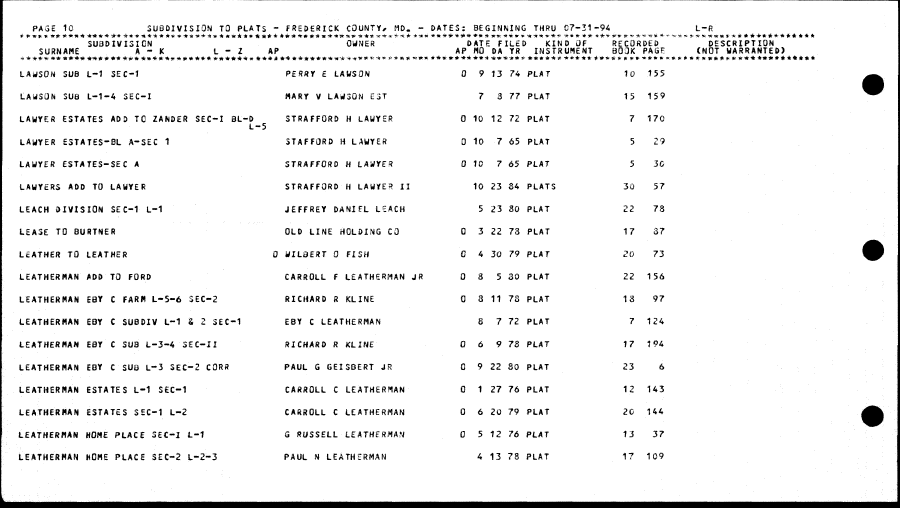 | LAWSOW SUB L-1 SEC-1 P£f?«Y £ LAWSON 0 9 13 74 PLAT 10 155 LAWSQN SU8 L-1-4 SEC-I MARY V LAW3QN E3T 7 8 77 PLAT 15 159 LAWYER ESTATES ADO TO ZANDER SEC-I 8L-D STRAFFORD H LAWYER 0 10 12 72 PLAT 7 170 L-5 LAWYER ESTATES-BL A-SEC 1 STAFFORD H LAWYER 0 10 7 65 PLAT 5 29 LAWYER ESTATES-SEC A STRAFFORD H LAWYER 0 10 7 65 PLAT 5 30 LAWYERS ADD TO LAWYER STRAFFQRD H LAWYER II 10 23 84 PLATS 30 57 LEACH DIVISION SEC-1 L-1 JEFFREY DANIEL L£ACH 5 23 30 PLAT 22 78 LEASE TO BU8TNER OLD LINE HOLDING CO 0 3 22 73 PLAT 17 37 LEATHER TO LEATHER 0 WIL0EHT 0 FISH 0 4 30 79 PLAT 20 73 LEATHE8MAN ADD TO FORD CARROLL F LEATHERMAN JR Q 8 5 30 PLAT 22 156 LEATHERMAN E8Y C FARM L-5-6 3EC-2 RICHARD R KLINE 0 8 11 78 PLAT 13 97 LEATHERMAN E8Y C SU8DIV L-1 & 2 SEC-1 EBY C LEATMERHAN 8 7 72 PLAT 7 124 LEATHERMAN EBY C SUB L-3-4 SEC-JI RICHARD R KL1NE 0 6 9 78 PLAT 17 194 LEATHERMAN EBY C SUQ L-3 SEC-2 CORR PAUL G GEISBERT JR 0 9 22 80 PLAT 23 6 LEATHERHAN ESTATES L-1 SEC-1 CARROLL C LEATHERMAN 0 1 27 76 PLAT 12 143 LEATHERHAN ESTATES SEC-1 L-2 CA8ROLL C LEATHERMAN 0 6 20 79 PLAT 20 144 L£ATHER«A« HOME PLACE SEC-J L-1 G RUSSELL LEATHERMAN 0 5 12 76 PLAT 13 37 LEATHERMAN HOME PLACE SEC-2 L-2-3 PAUL H LEATHERMAN 4 13 78 PLAT 17 109 |